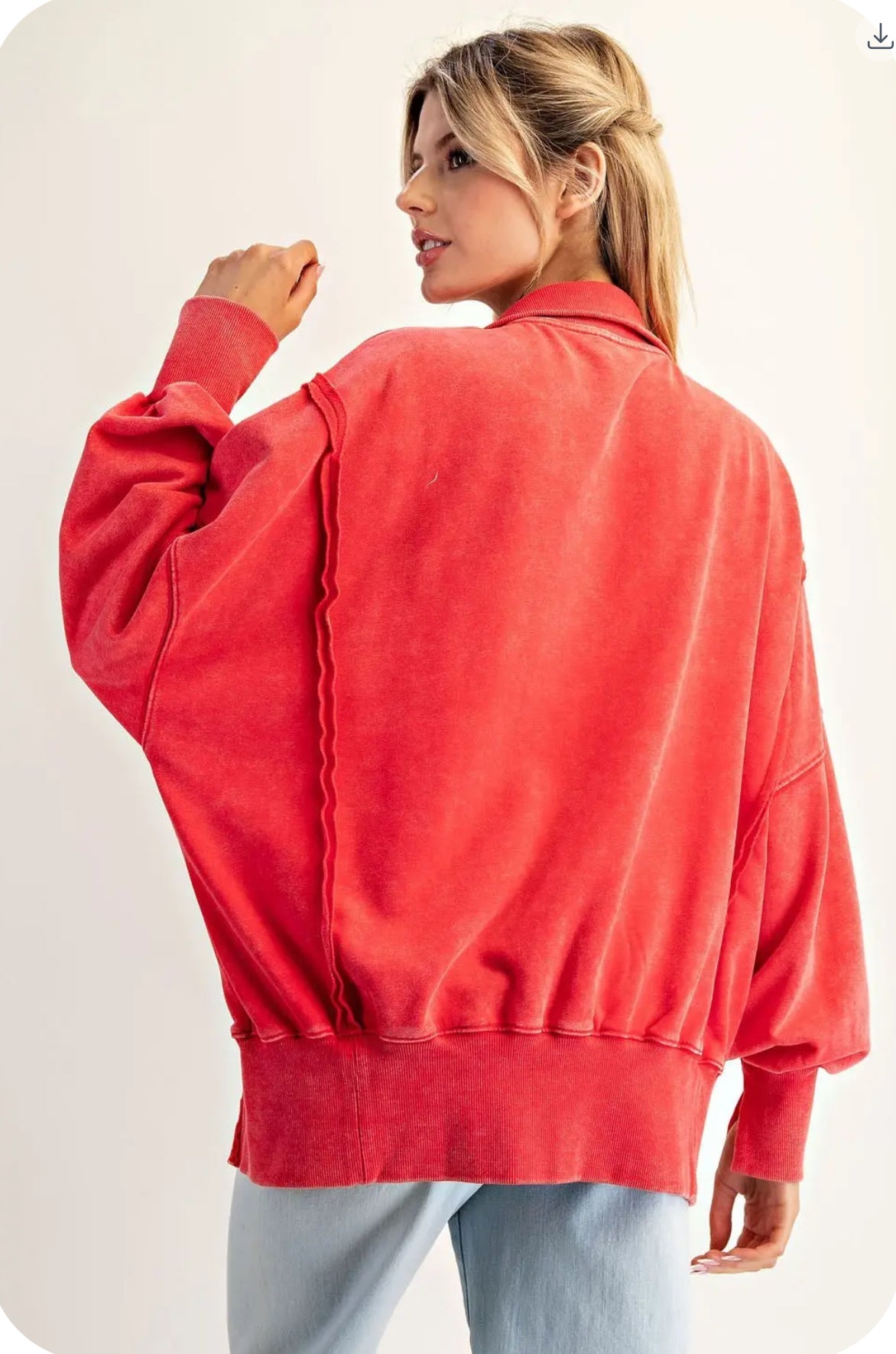 Product Detail: This red washed pullover features a collared neckline with snap button detailing, dropped shoulders with exposed seam accents, voluminous balloon sleeves with ribbed cuffs featuring subtle slits, and a relaxed high-low silhouette with side slits for an effortlessly laid back look.