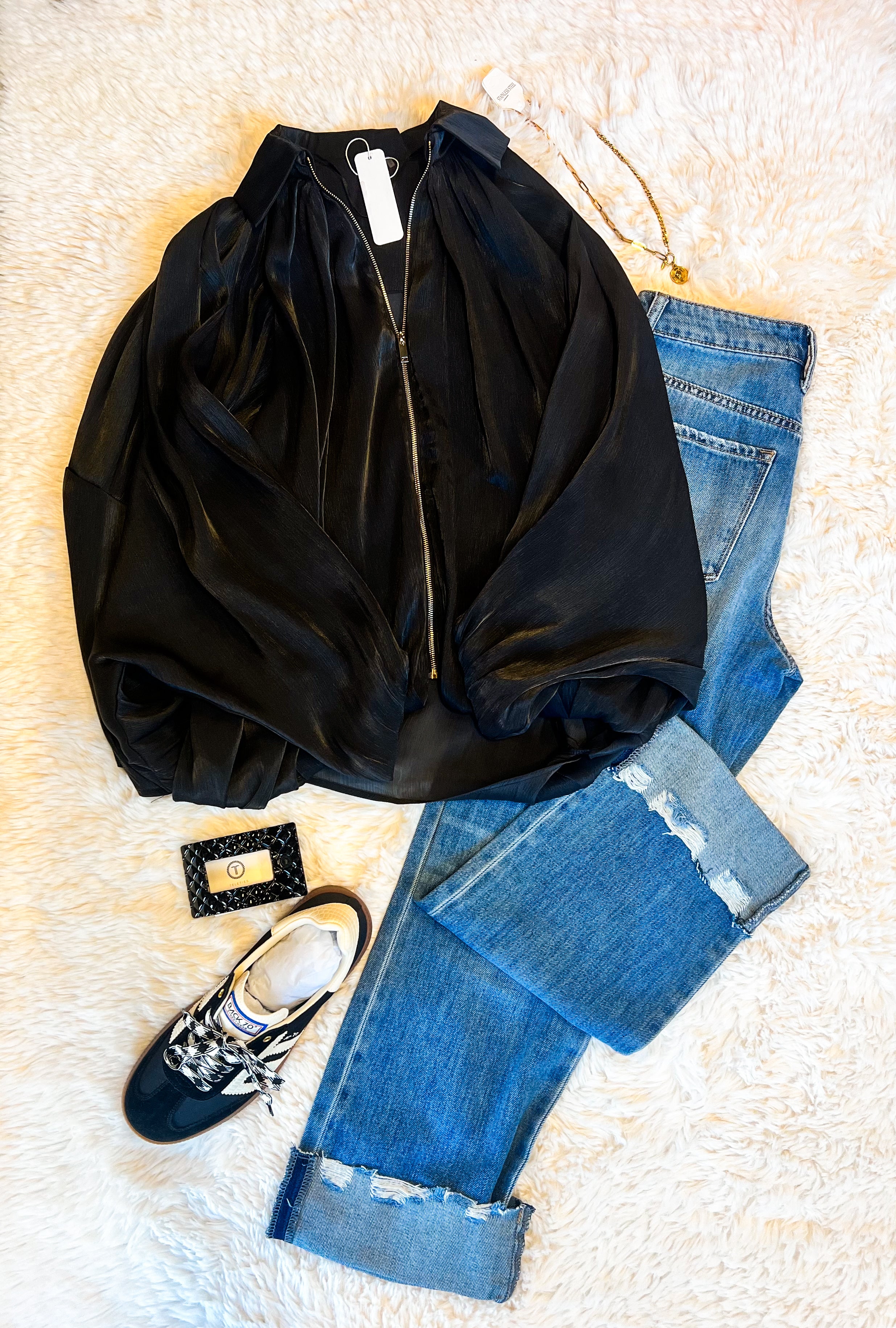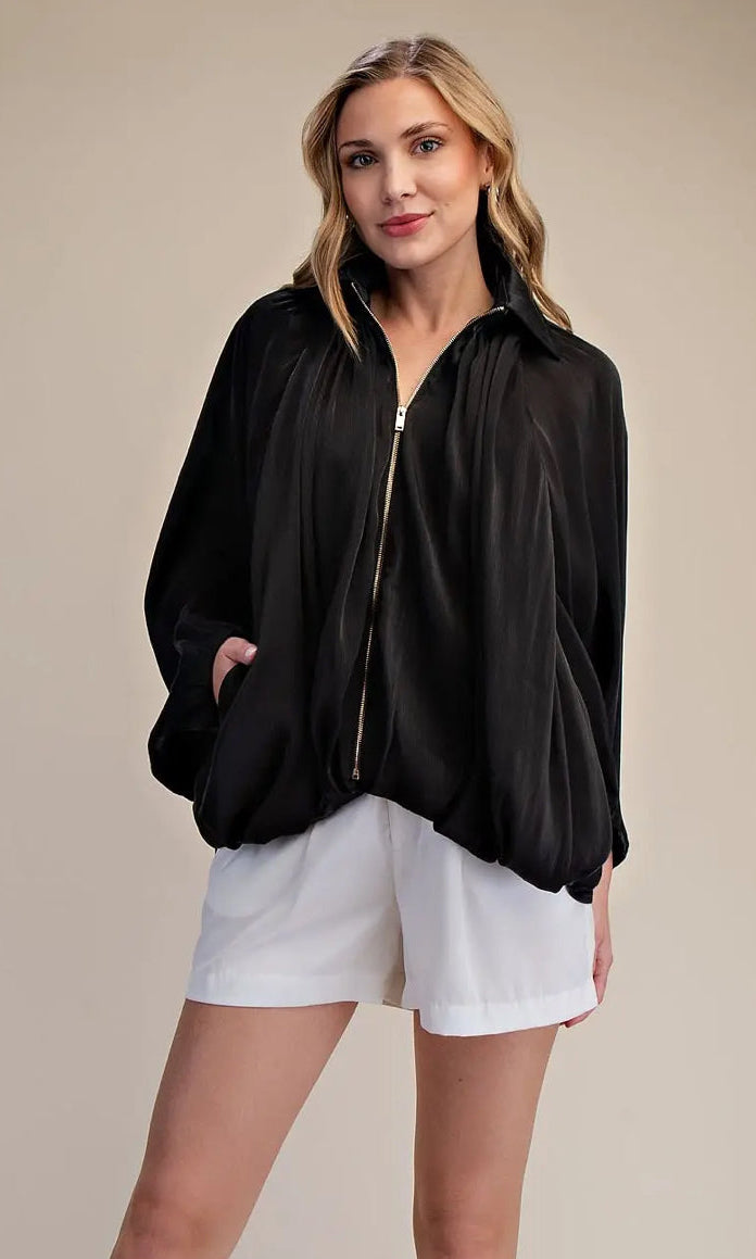 Make a statement with this black bomber jacket, featuring a gathered hem and puffed sleeves for modern edge. Crafted from soft, fluid fabric that moves with you, it's the perfect layer for casual outings or dressed-up occasions. The structured silhouette keeps things polished while the relaxed drape ensures all-day comfort. A versatile wardrobe essential that transitions seamlessly from season to season.