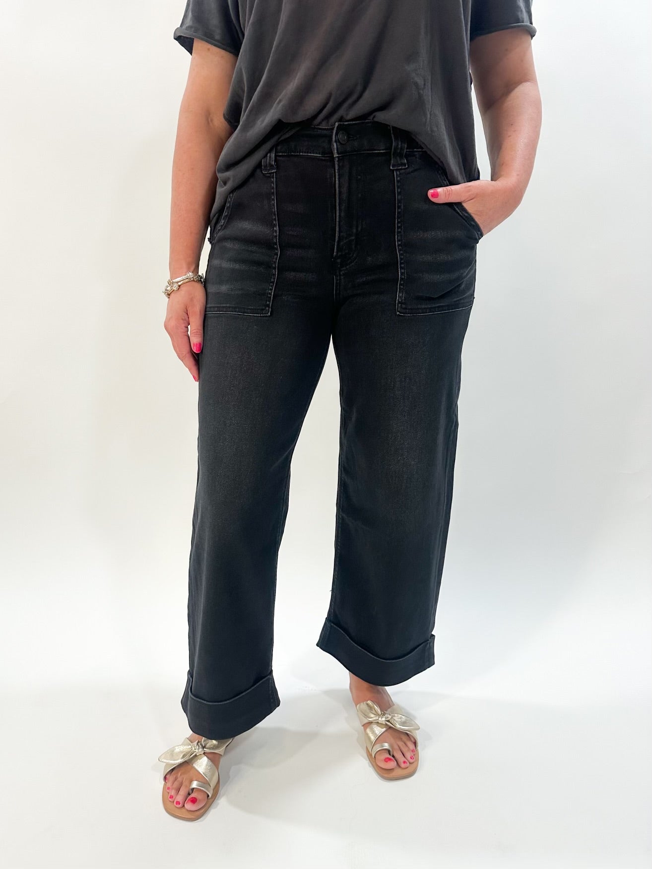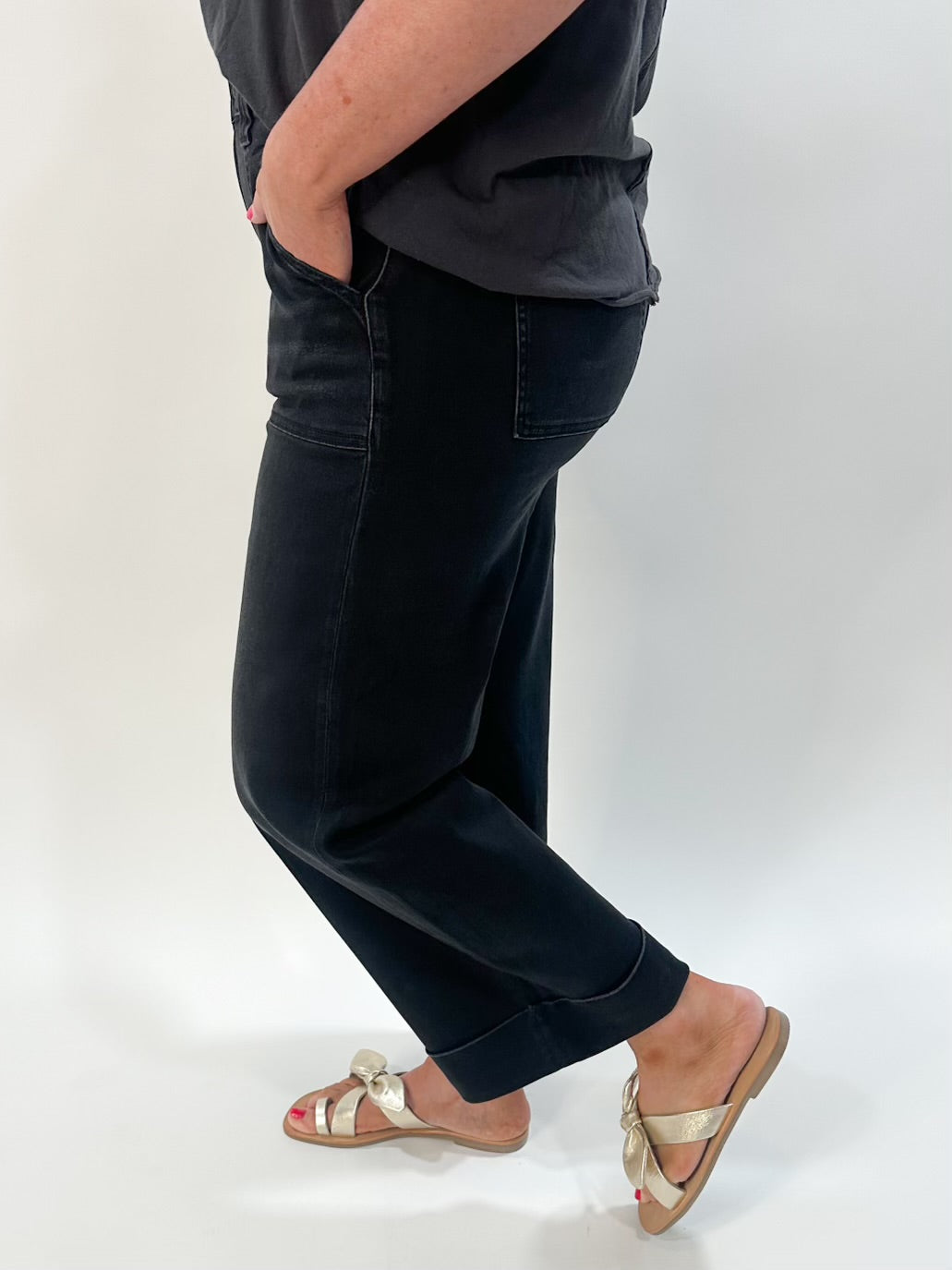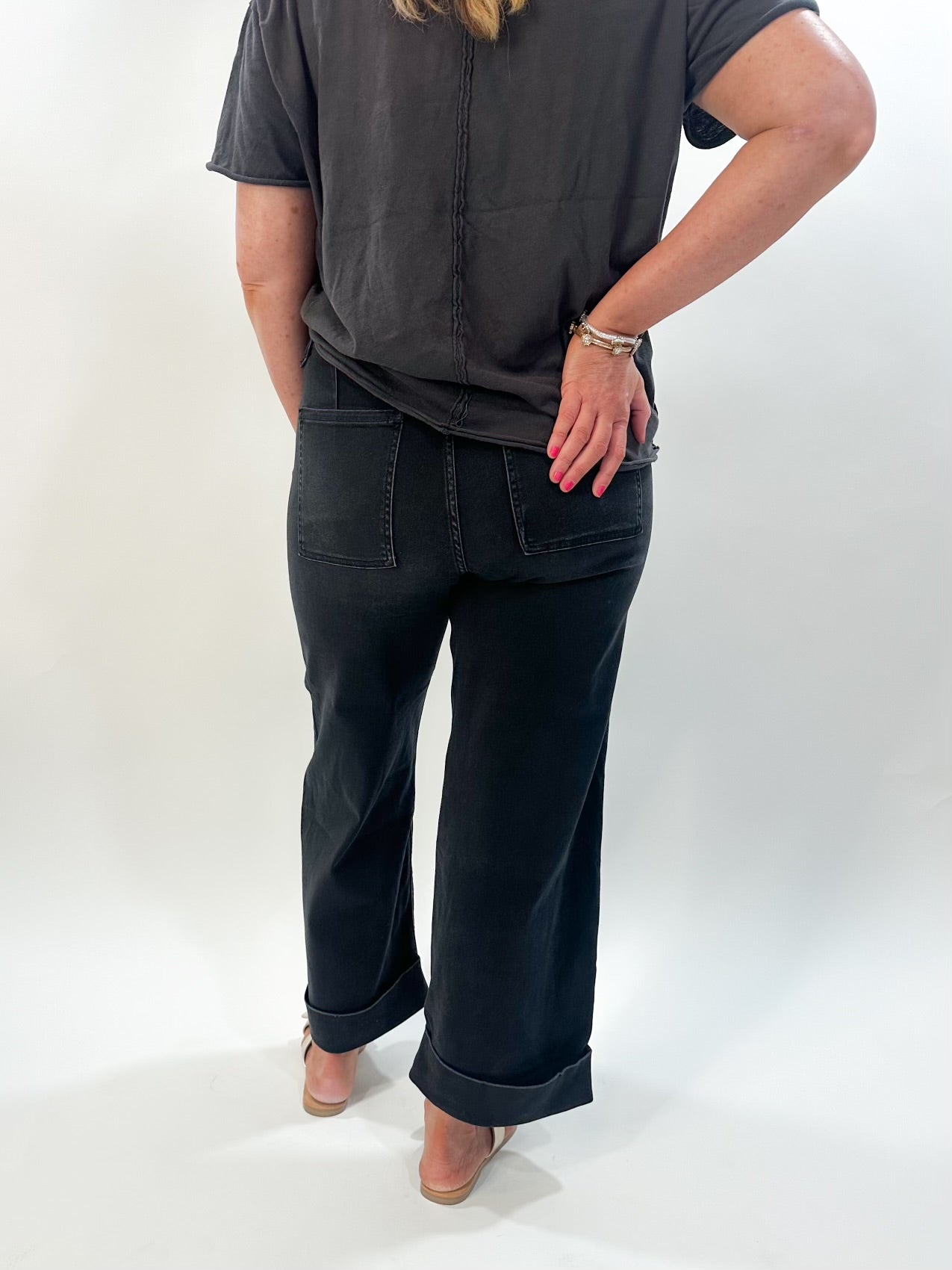Black high rise super soft baggy cuffed wide pants by Vervet