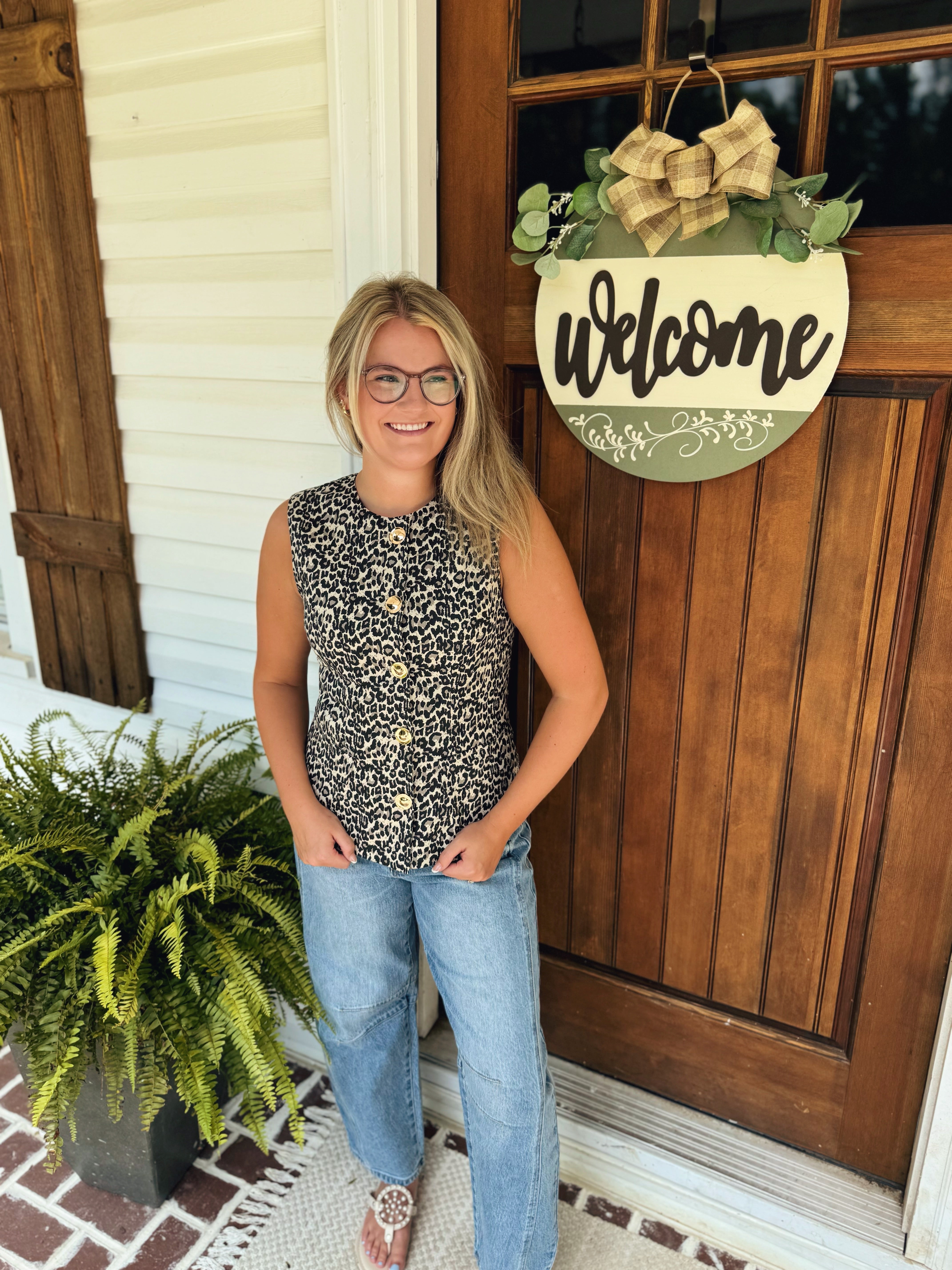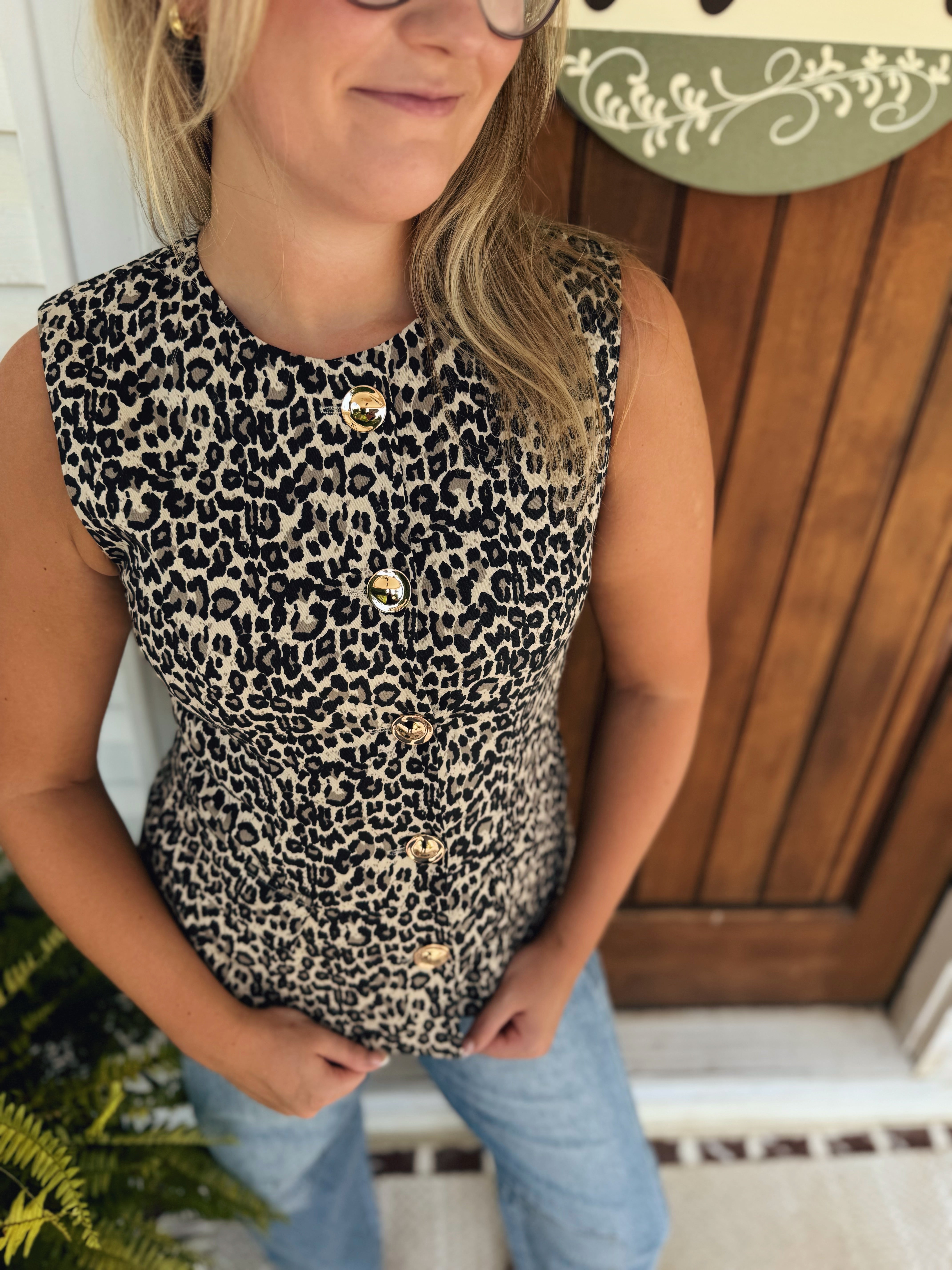 Add a wild twist to your outfit with this playful Cheetah Button Up Vest. Featuring eye-catching gold buttons, it’s perfect for layering and turning heads wherever you go. Embrace your fierce side with a touch of fun and flair!