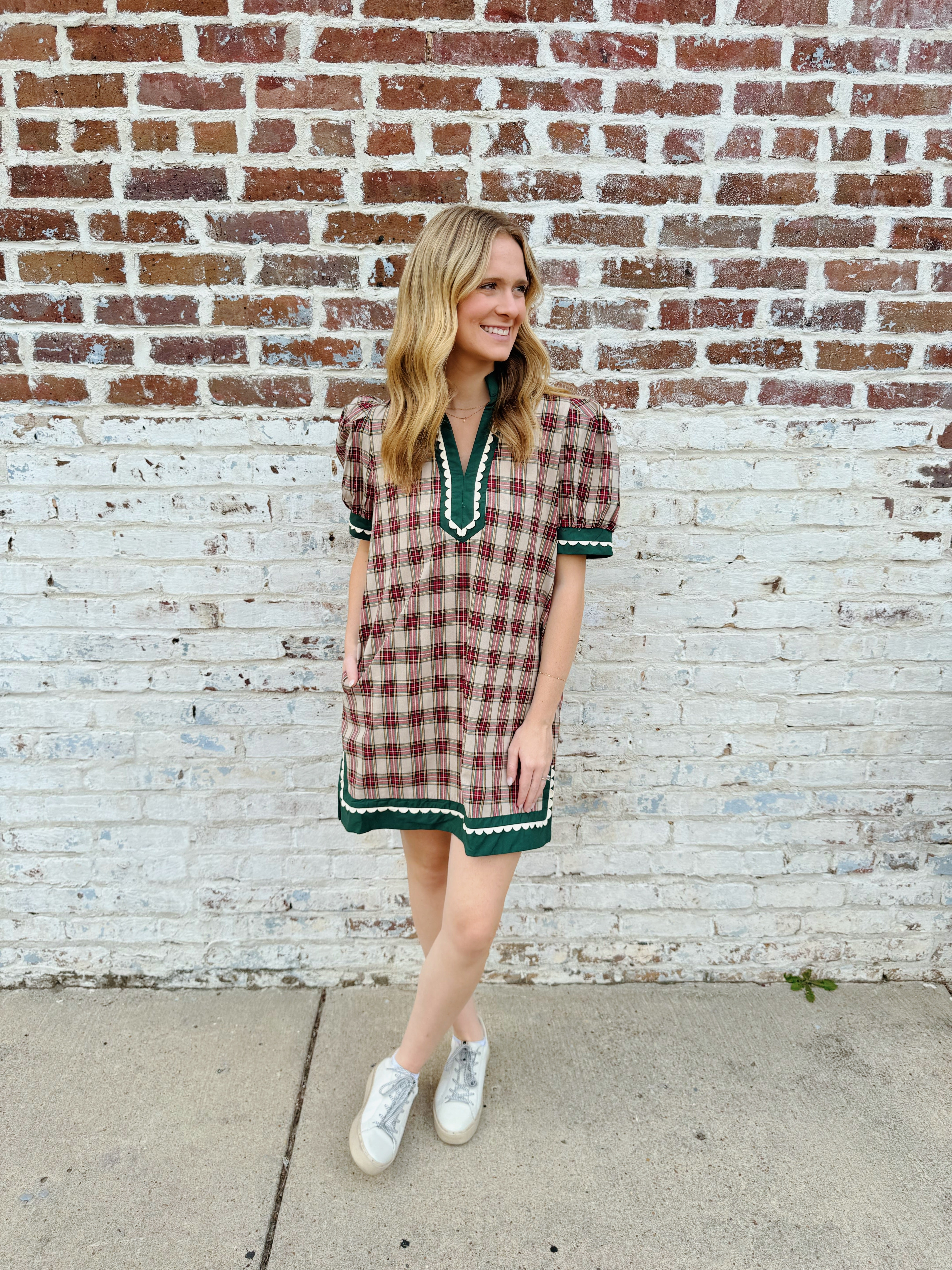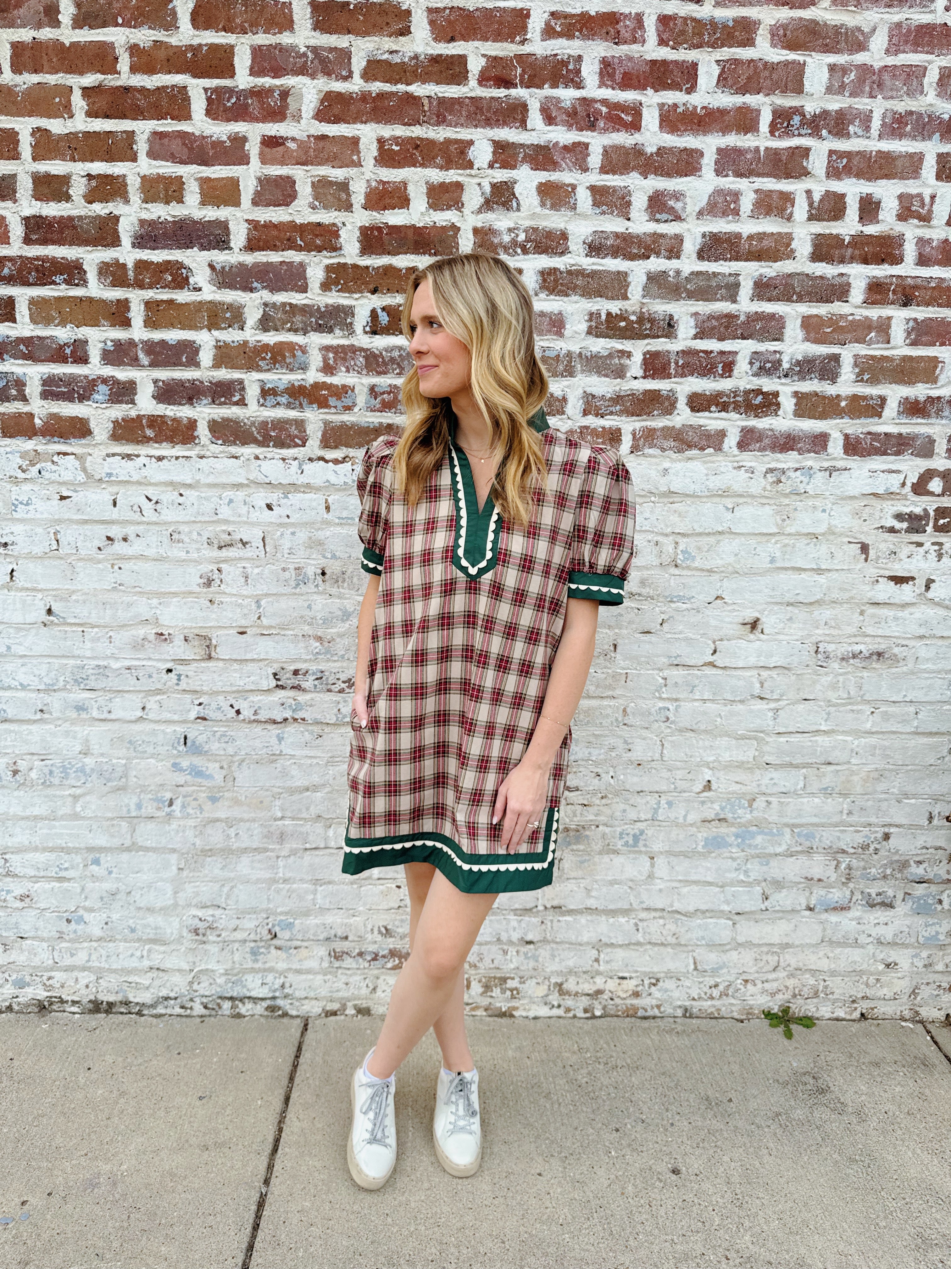 This Christmas In Plaid Dress combines cozy taupe and hunter green in a charming mini length, perfect for playful holiday vibes. The flattering V-neck adds a touch of fun, while handy pockets keep your essentials close. Ideal for festive gatherings or casual days, it’s your go-to for effortless style with a splash of seasonal cheer.