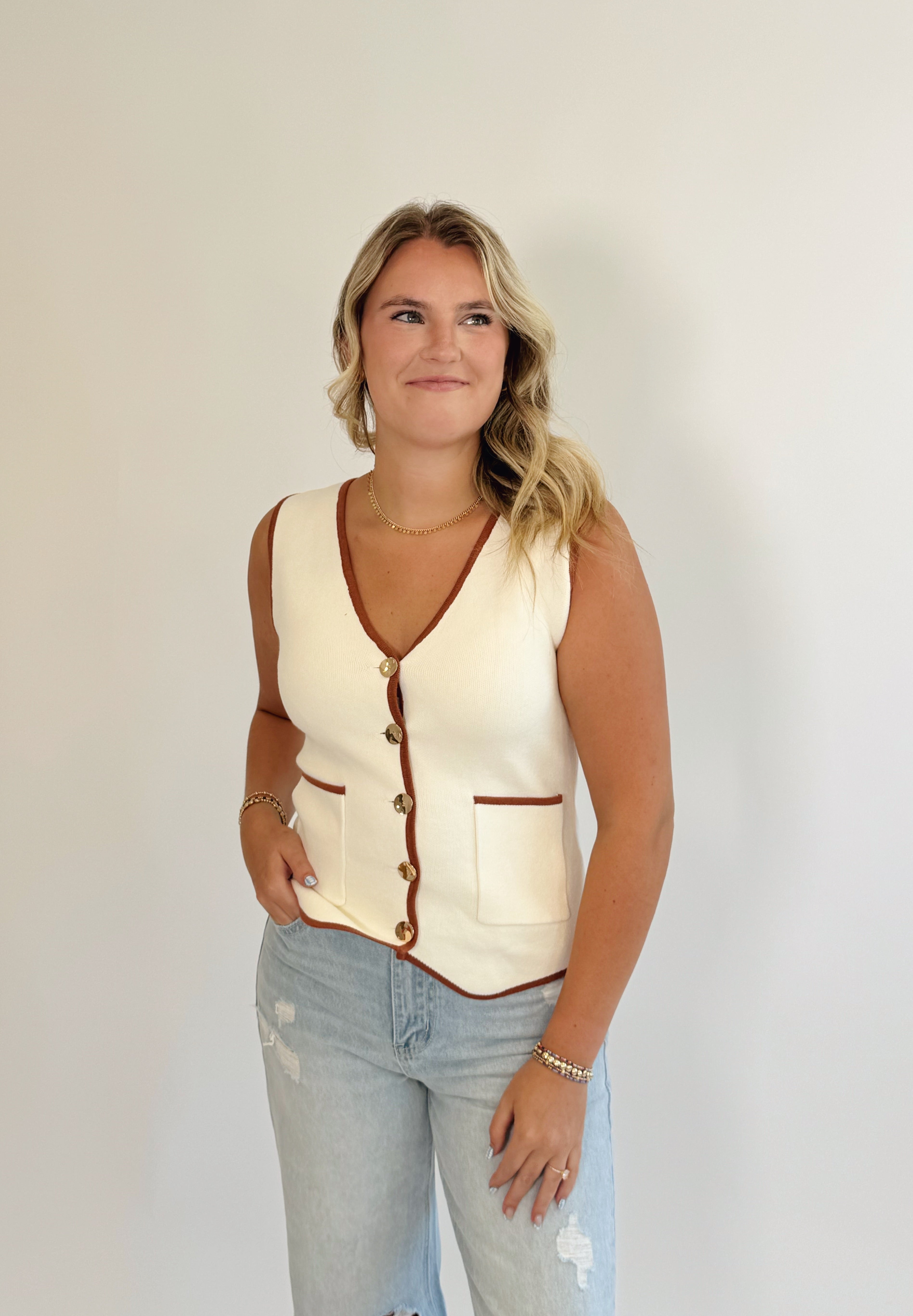 This Classy Cream Sweater Vest buttons up with ease and hugs your shape in the softest, most flattering way. Perfect for layering or wearing solo, it adds a cozy yet chic touch to any outfit. Get ready to turn heads with comfort and style!