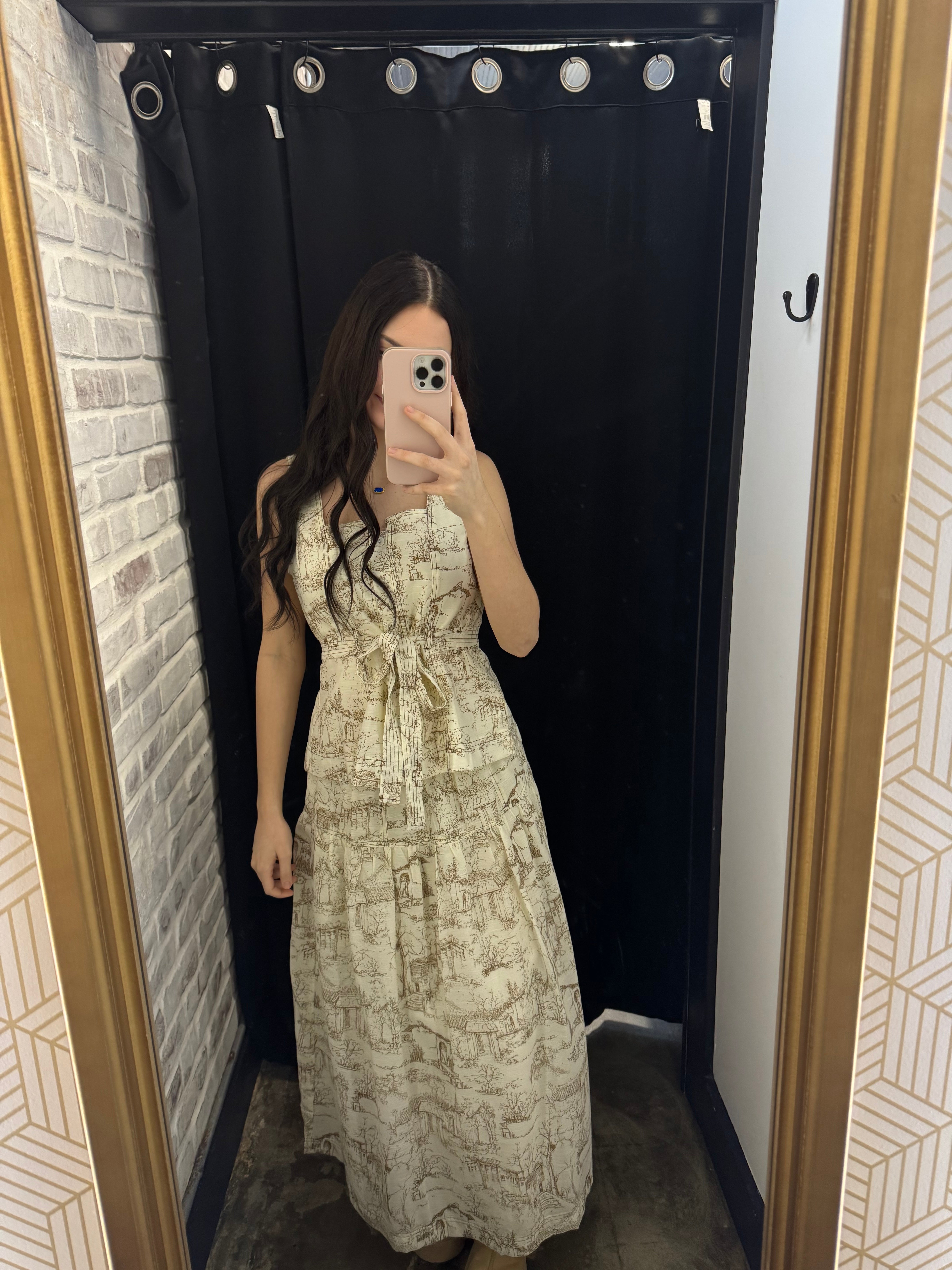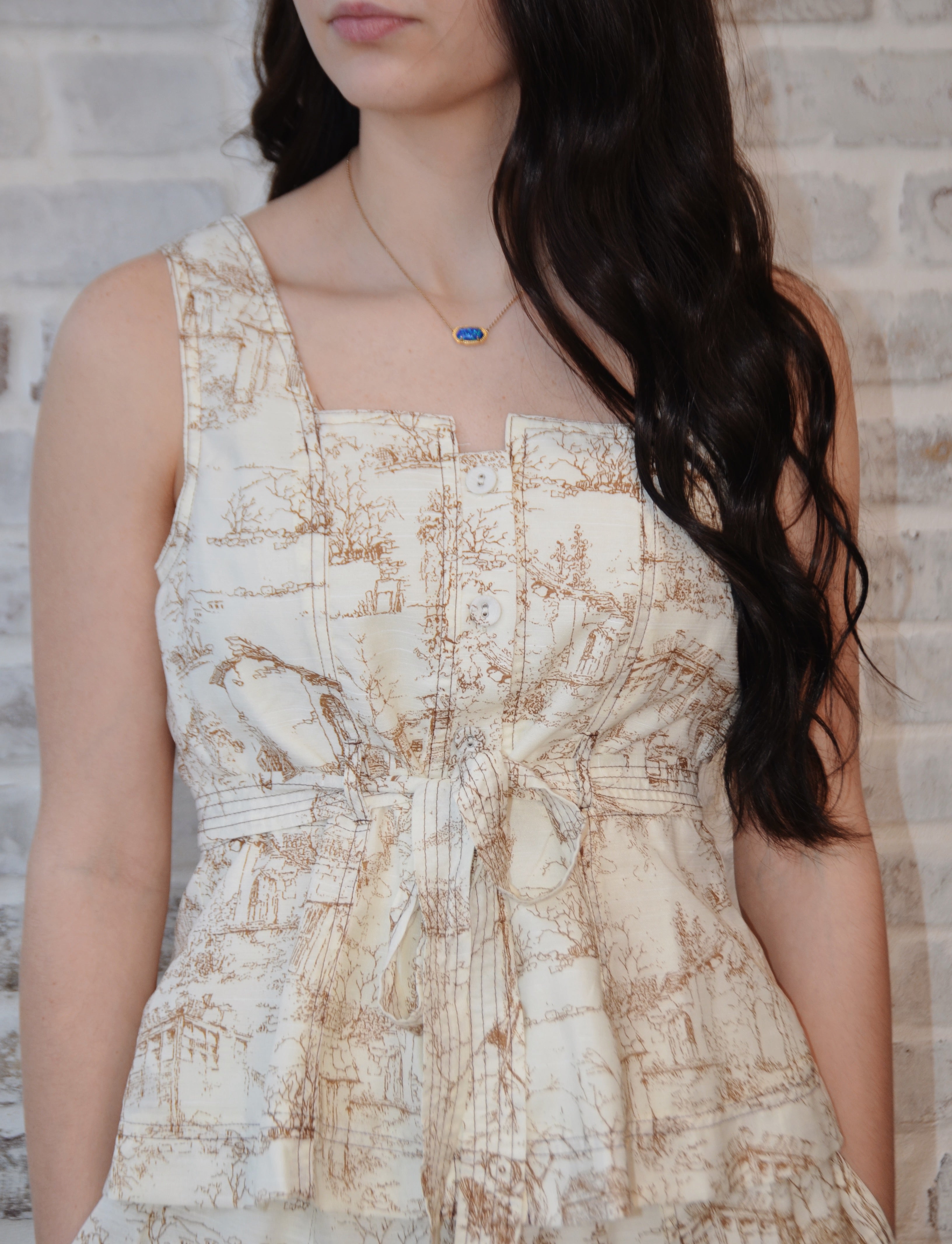 This printed coffee blend has a square neck front button down sleeveless top will pair perfect with our coffee in Italy skirt.