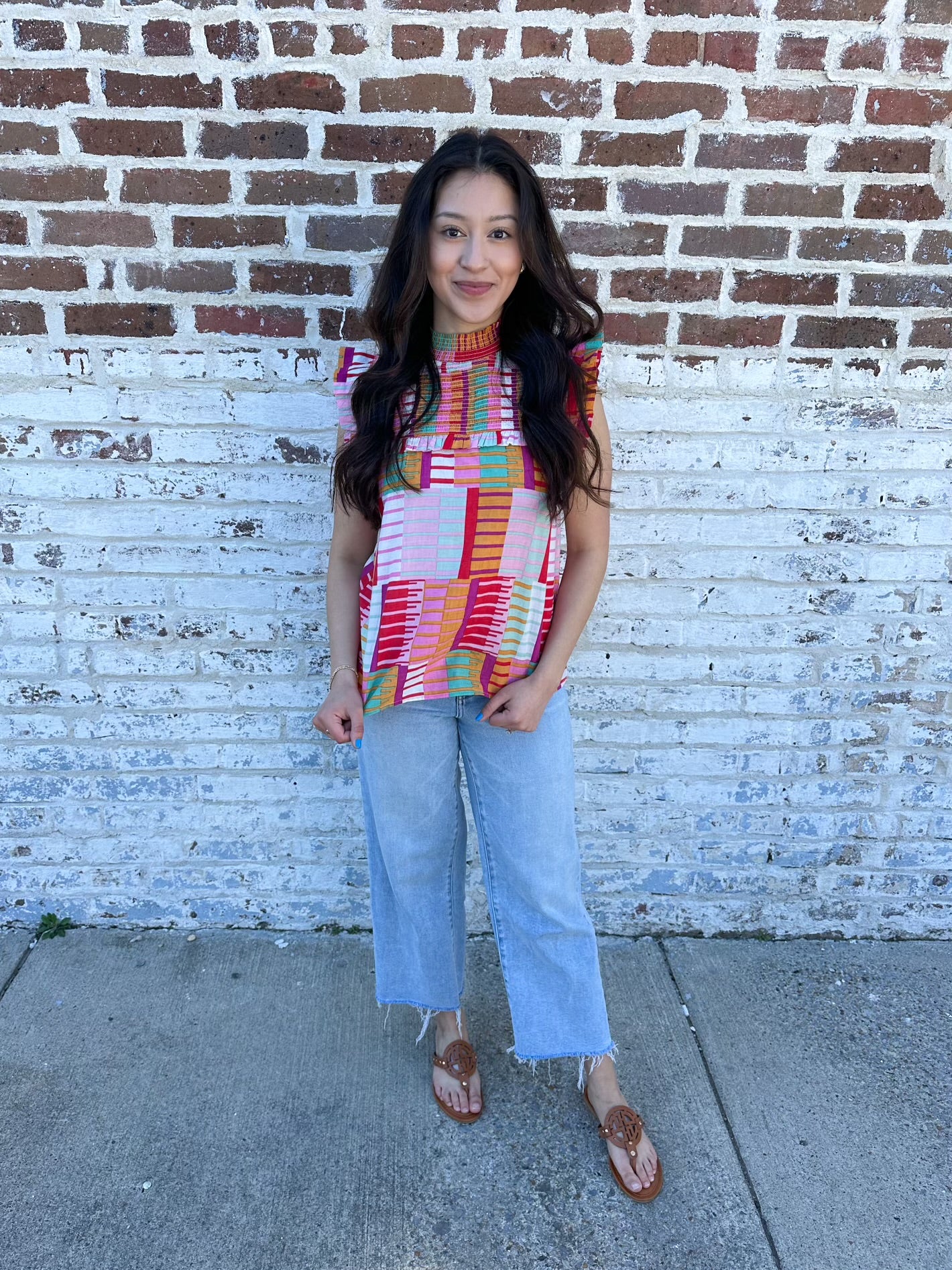 This THML mock neck top features a colorful pattern that will elevate any outfit. With its playful design and vibrant colors, this top is perfect for adding a touch of fun to your wardrobe. Express your unique style with this must-have piece!