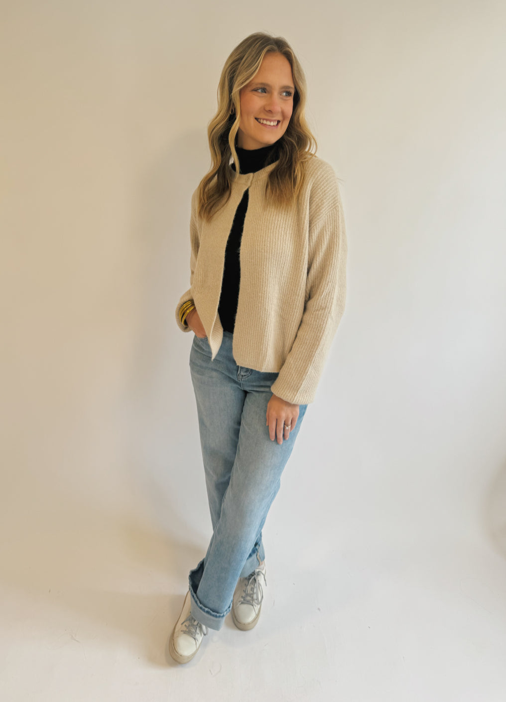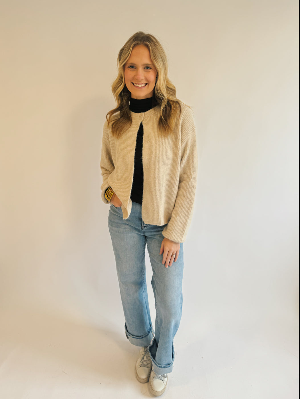 Cozy cream cardigan featuring a single button closure right at the neckline for a cute and simple touch.