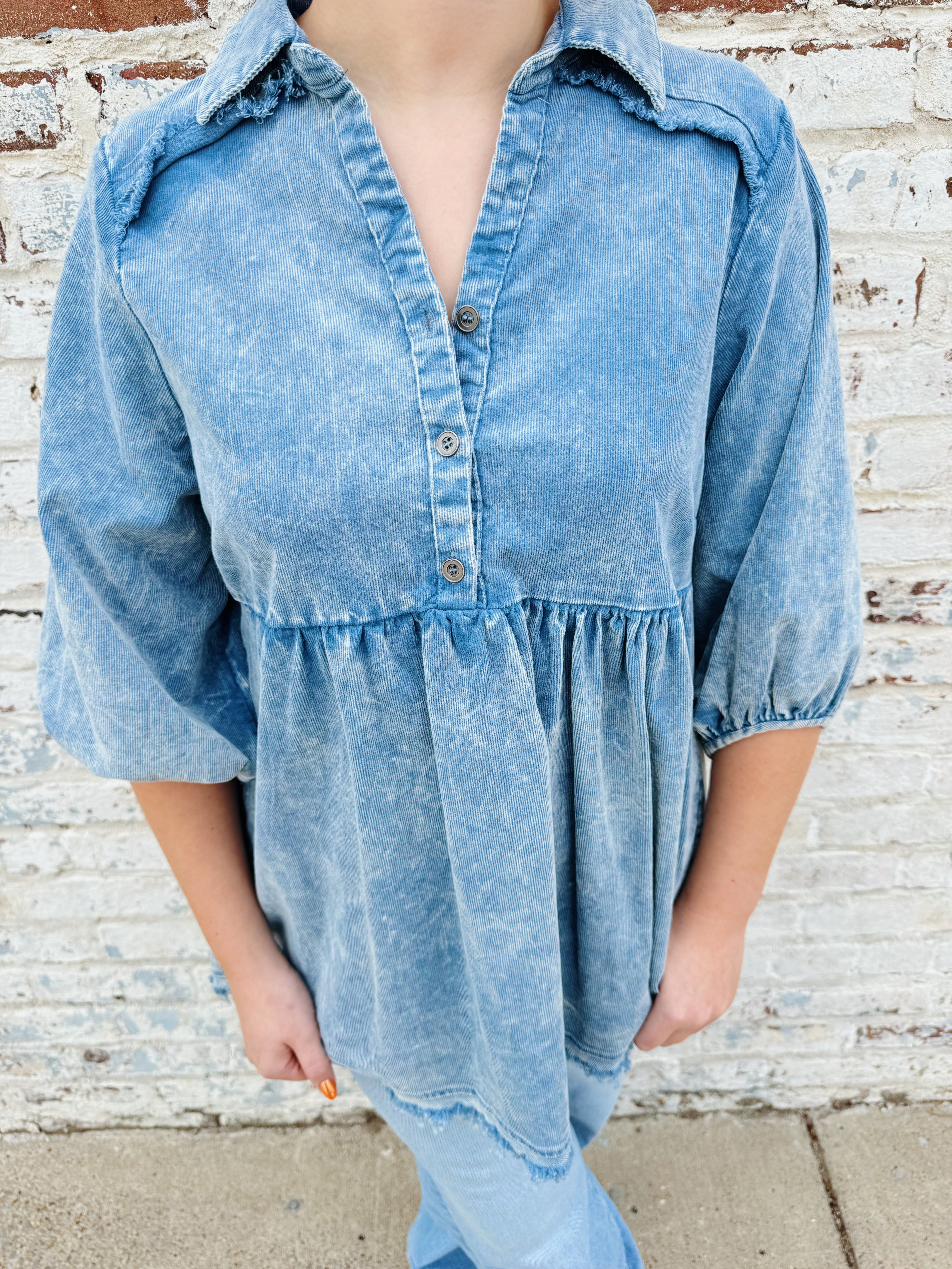 Introducing our Denim Blue Tunic Dress - the perfect combination of chic and quirky! This dress features a stone wash corduroy fabric with a half button down design, making it effortless to wear. No lining necessary. Stand out in denim with this playful tunic dress!
