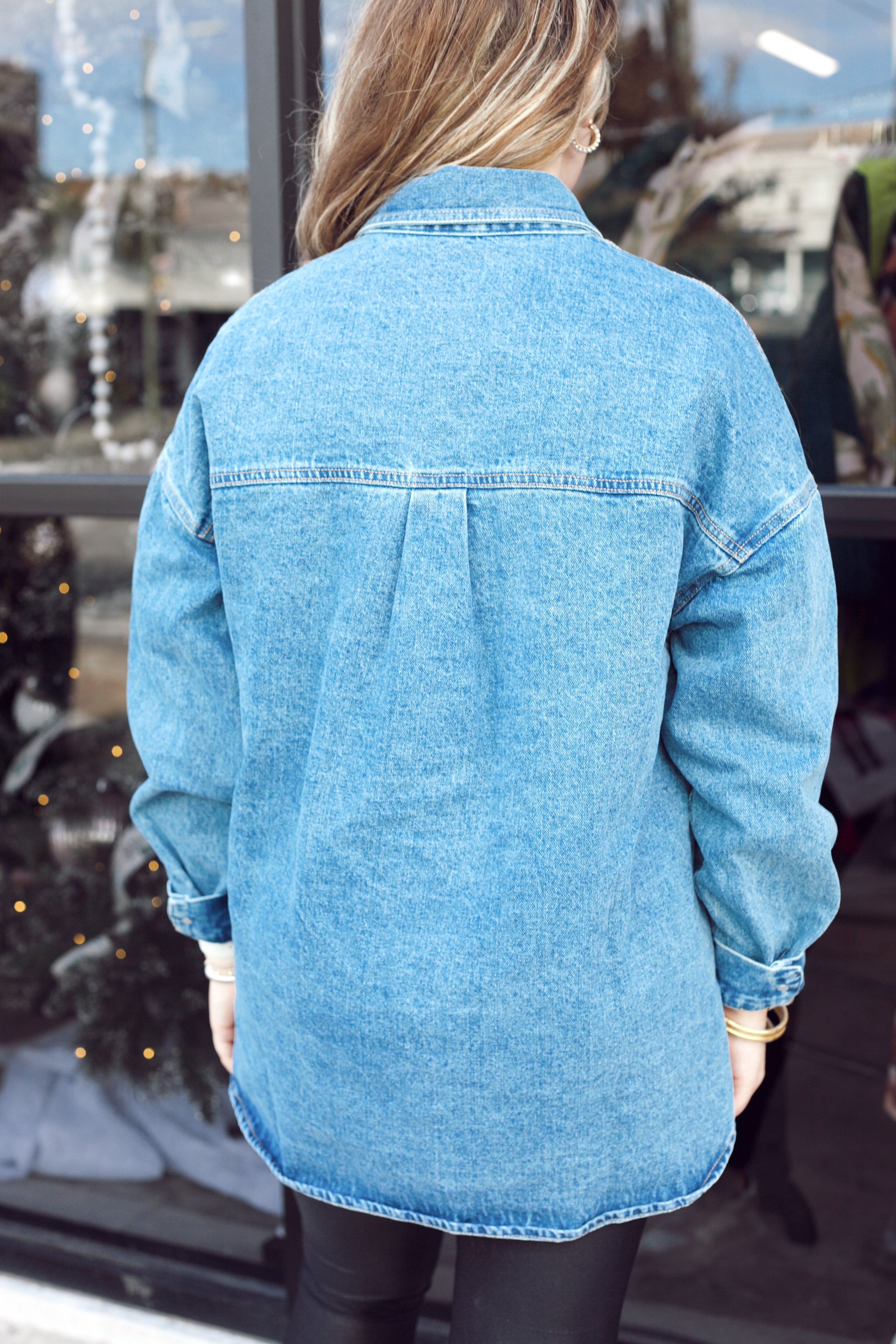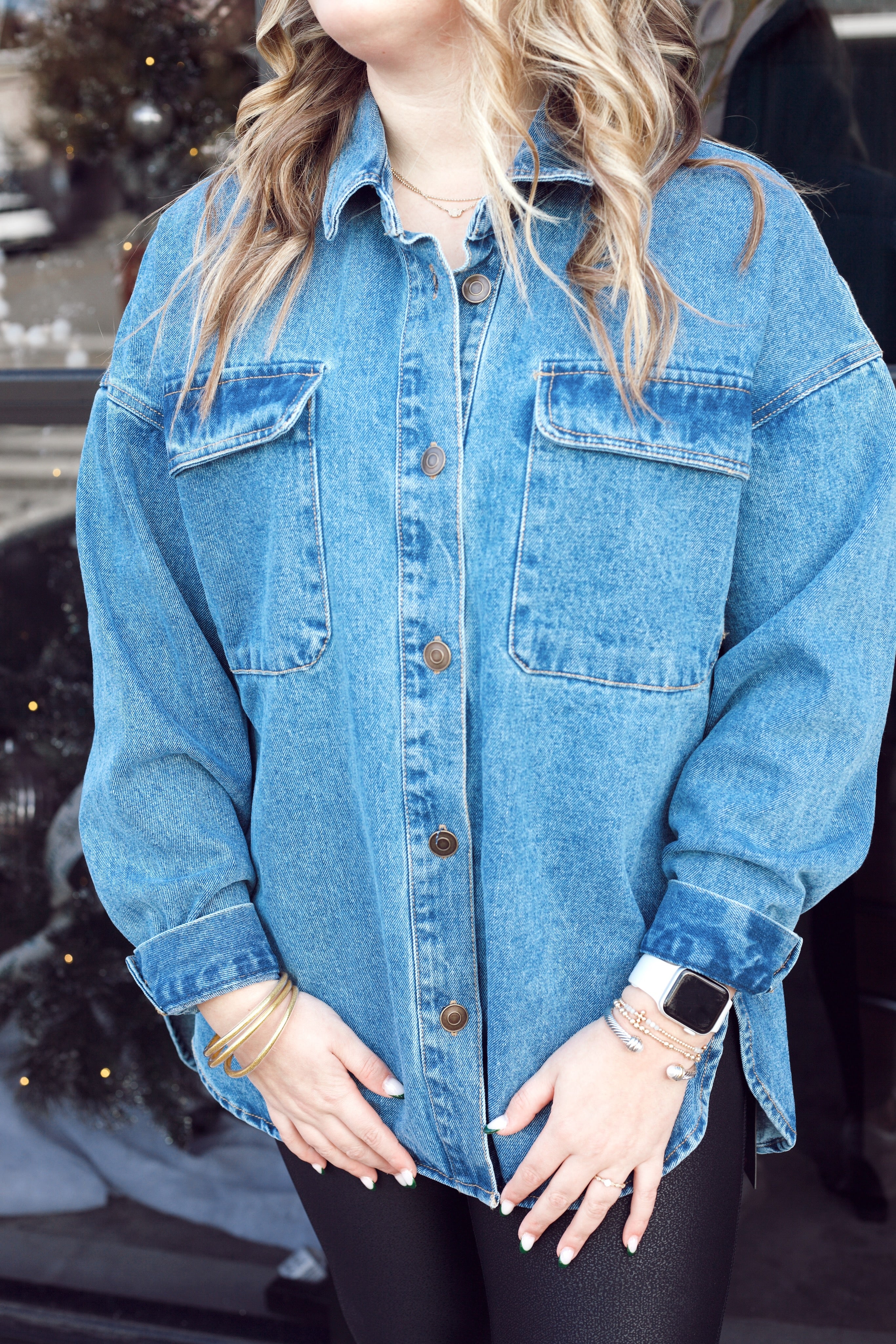 Look sharp and stay cozy in this one-of-a-kind DENIM SHACKET. This stylish oversize denim jacket combines the best of a shirt and a jacket for a look that packs a punch! You'll look as cool as a cucumber without skimping on comfort. Get yours today and get ready to turn heads!