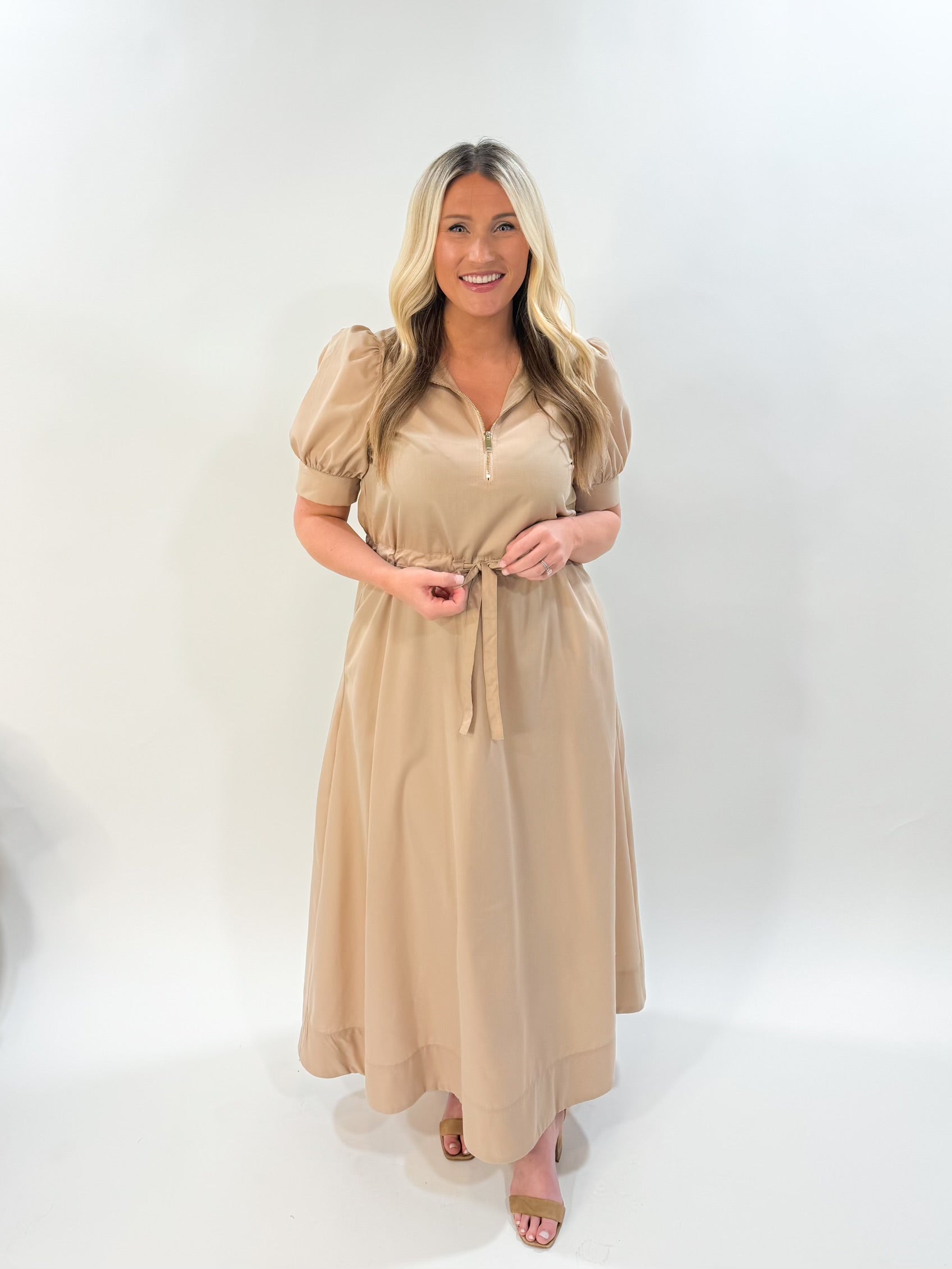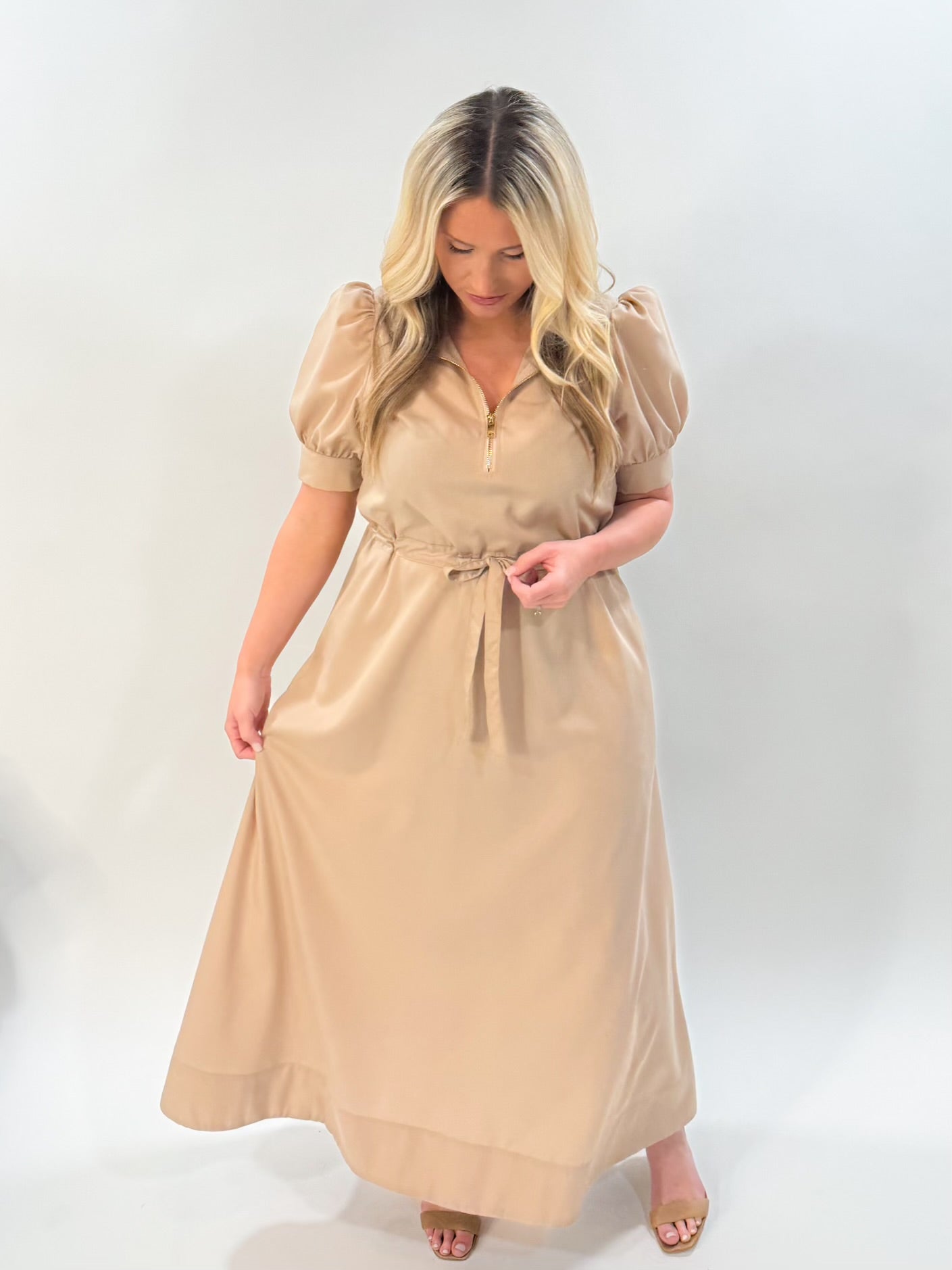 light taupe maxi dress with a drawstring at the waist
