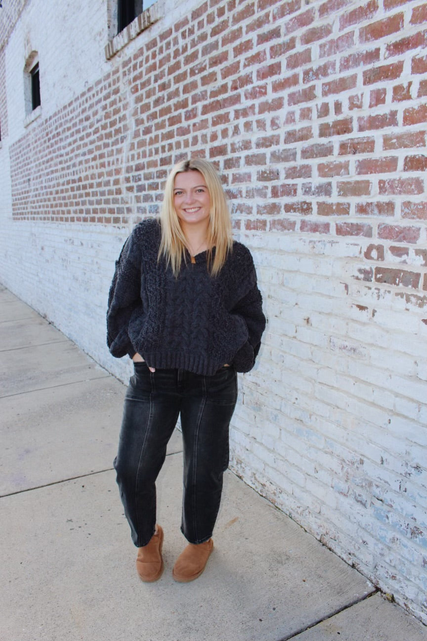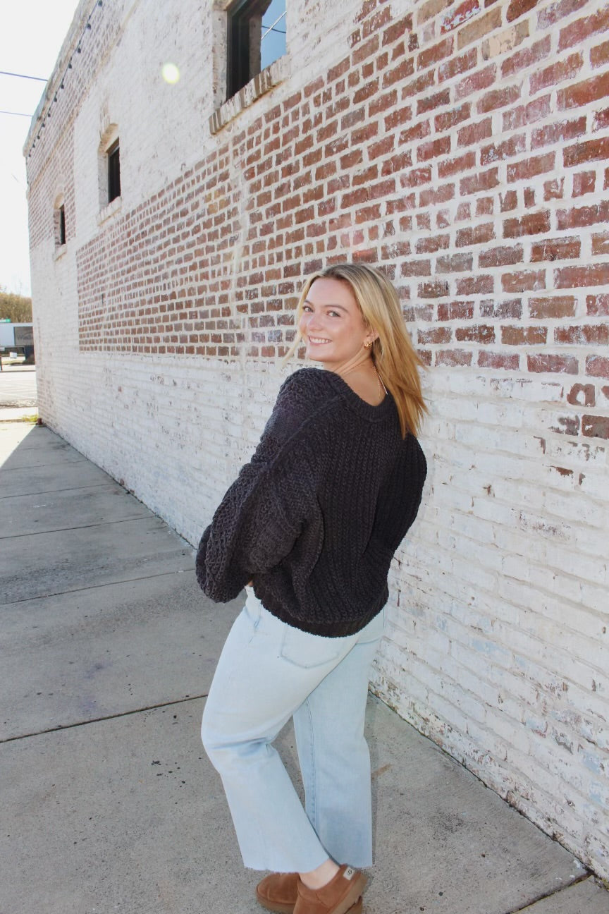 Get cozy and stylish with our Ghost Grey Sweater! This semi-cropped sweater is designed in the USA with a unique twist (literally) - its chenille knitting detail adds texture and dimension. A playful v-neck and balloon sleeves complete the look. Perfect for fall and winter, this sweater is a solid choice for staying warm and stylish.