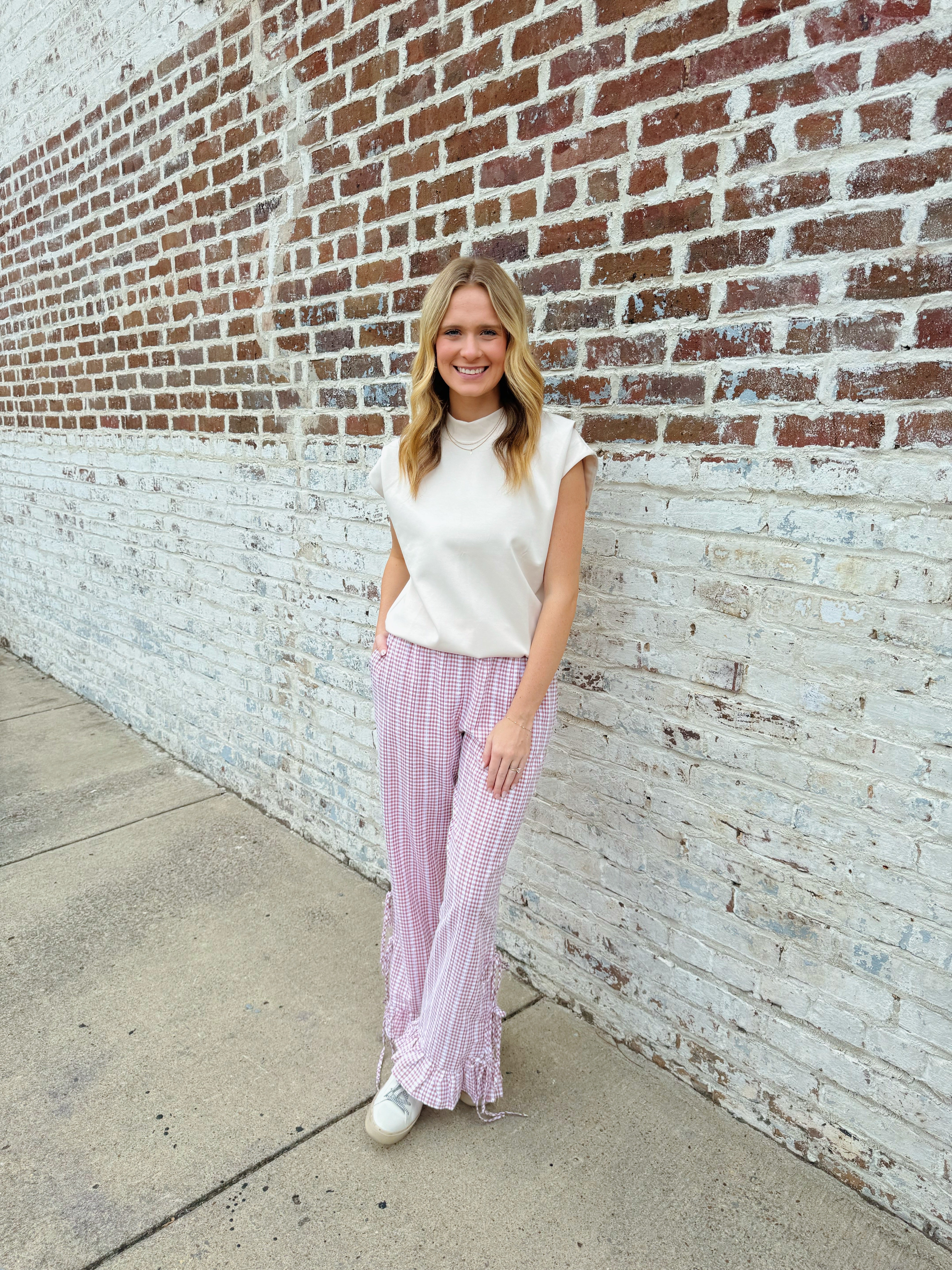 Cute cream and dark mauve gingham side slit pants with a ruffle hem