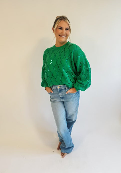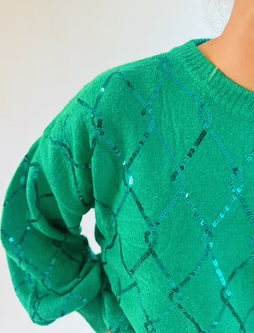 Green Long Sleeve Sequin Diamond Patterned Sweater