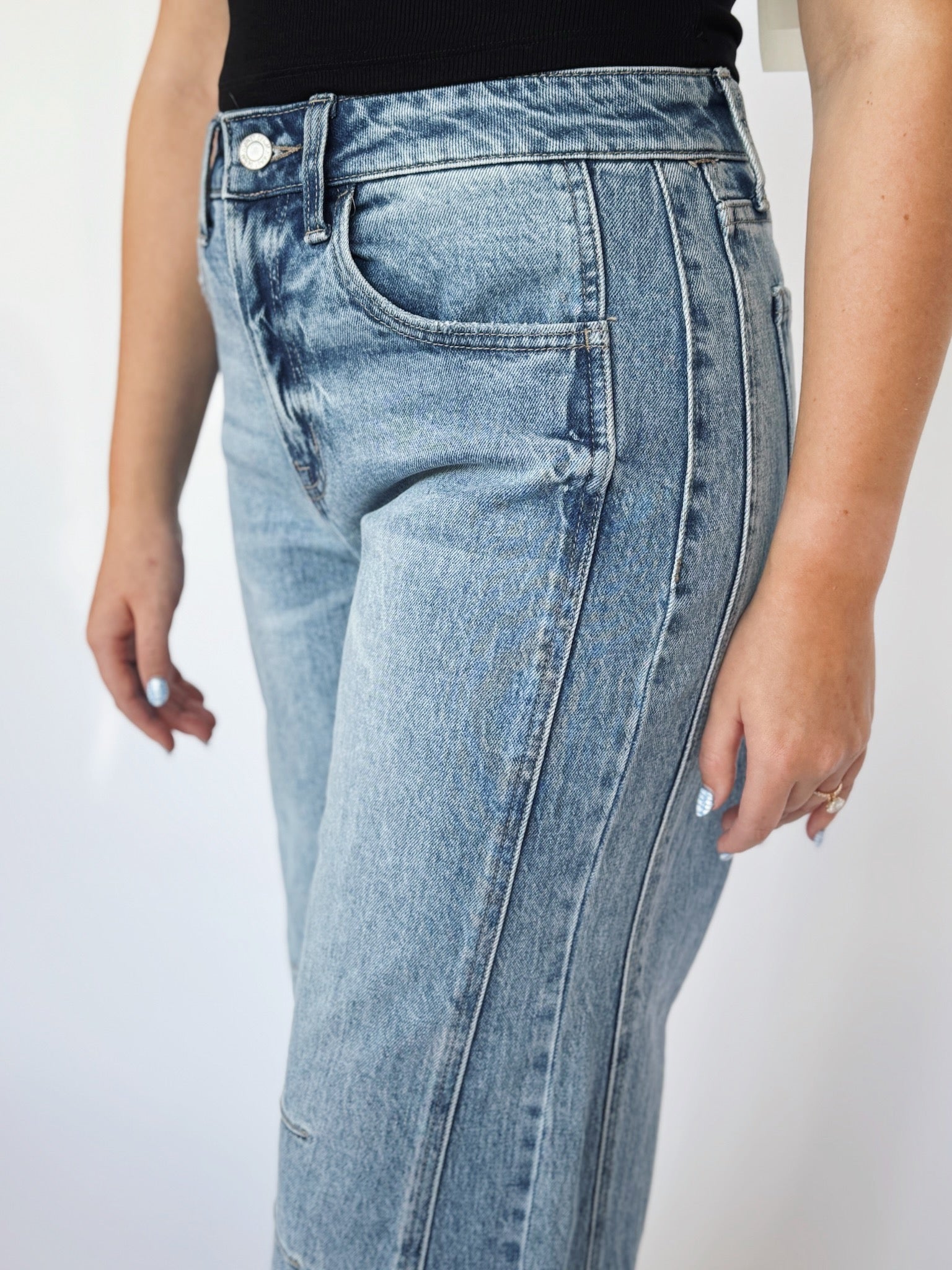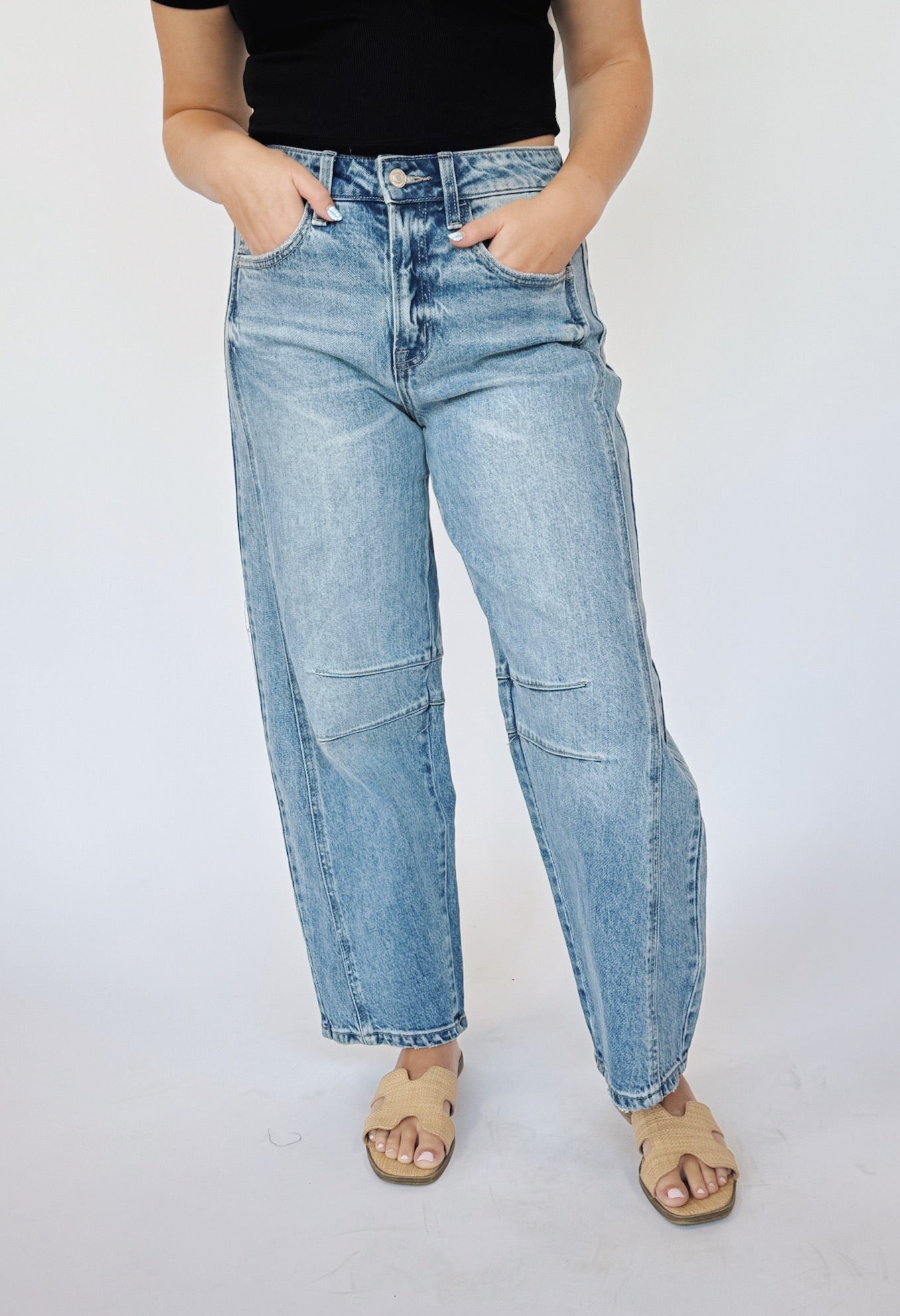 Get ready to elevate your denim game with our High-Rise Barrel Jeans by Vervet. With a unique barrel silhouette, these jeans will make a statement wherever you go. Say goodbye to boring jeans and hello to effortless style.