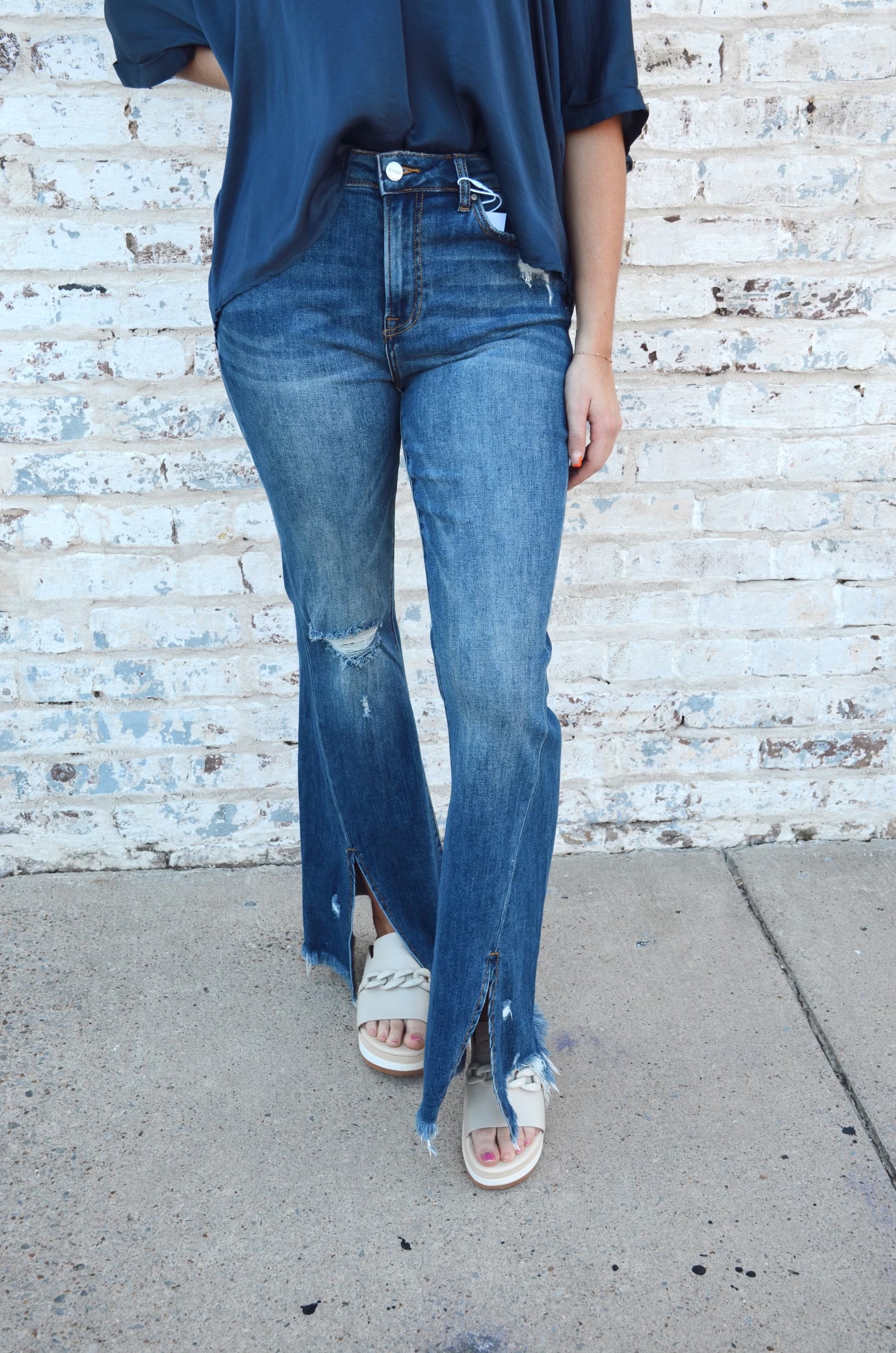 Strike a pose in our HIGH RISE FLARE JEANS! Featuring a high-rise waist and a frayed hem for extra attitude, you'll be setting trends and raising the bar for style. So come on, don't be shy - reach for the sky and show off those fab legs! (You got this!)