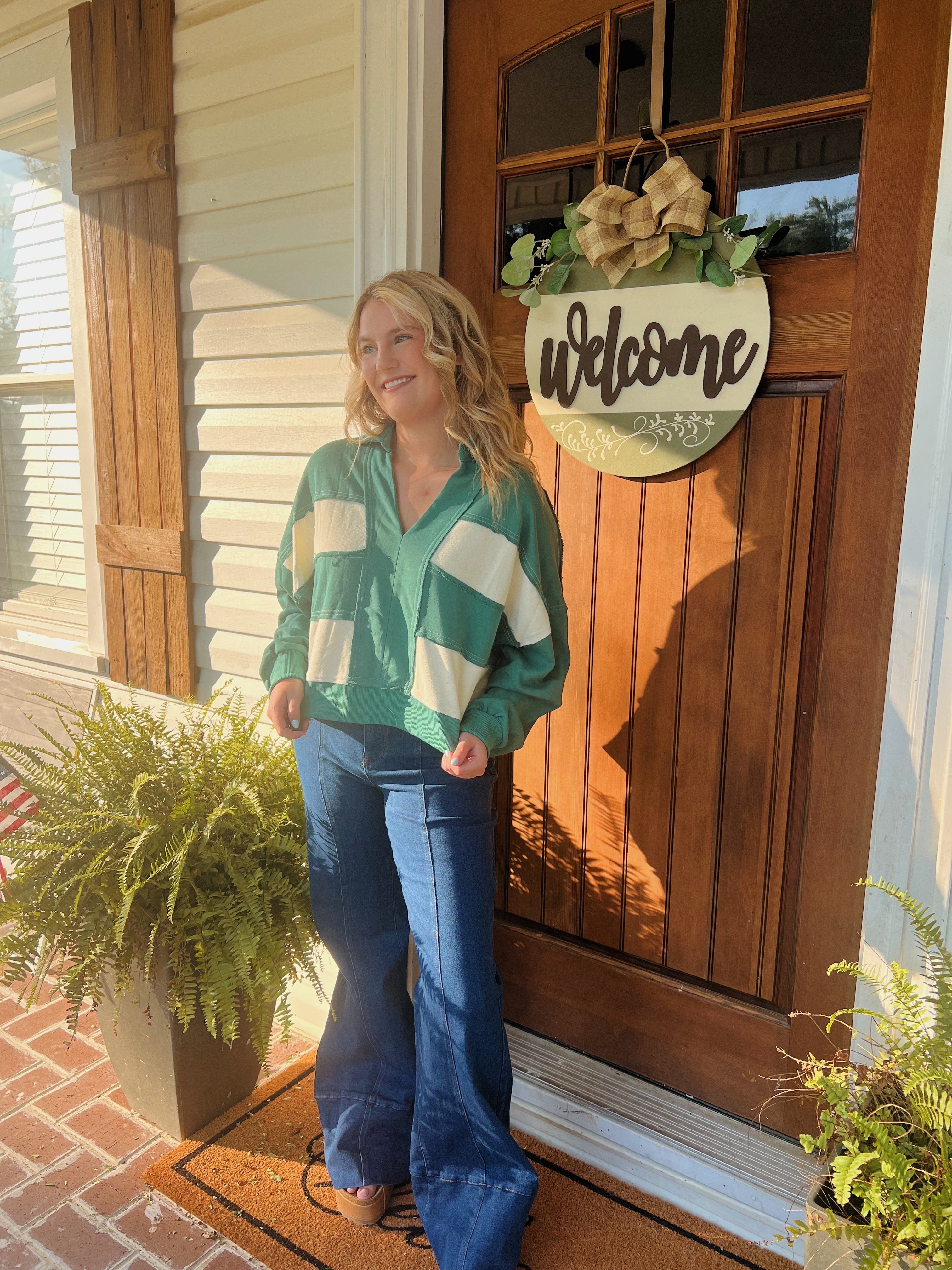 Hunter green and ivory striped collar v neck crop sweatshirt