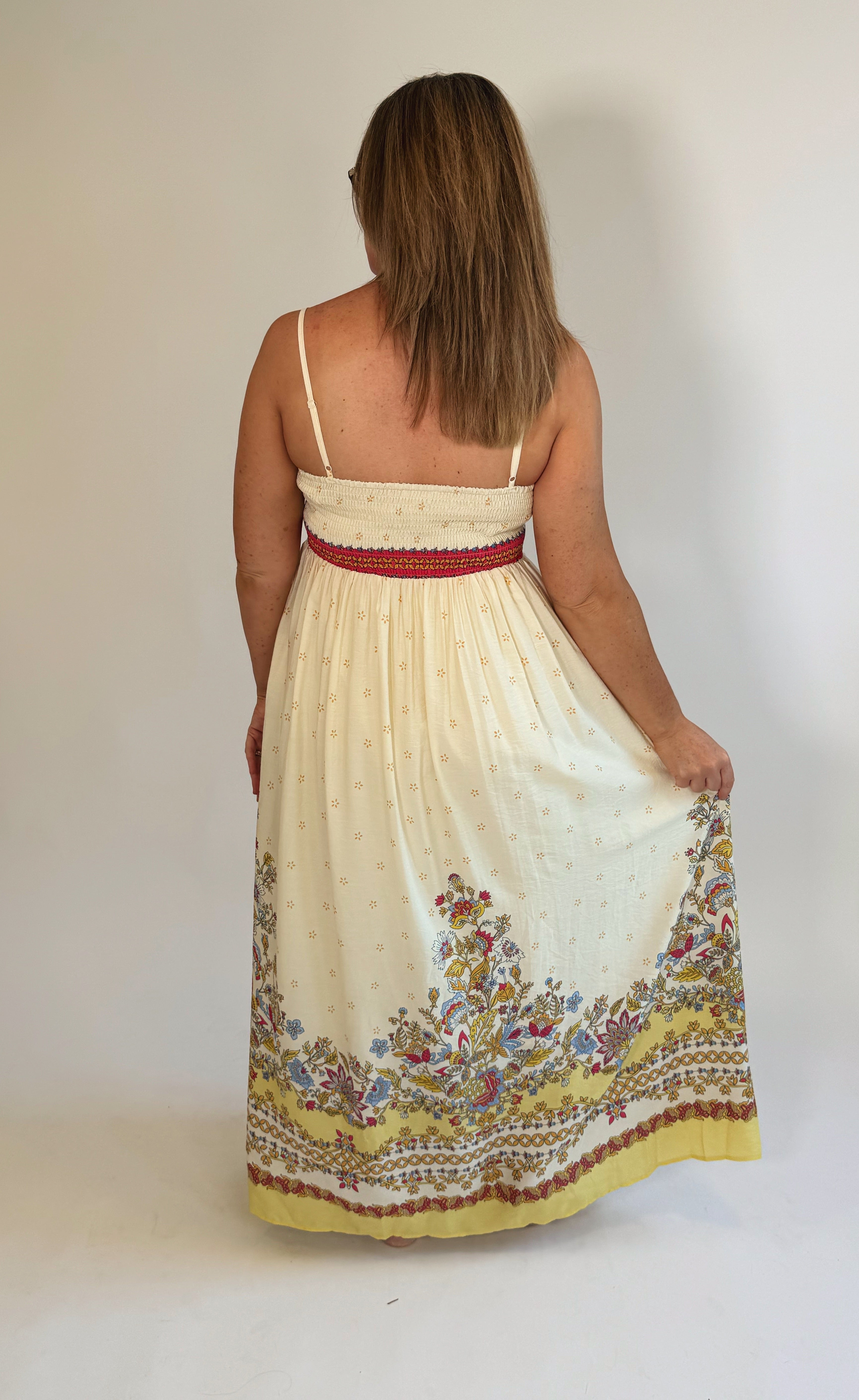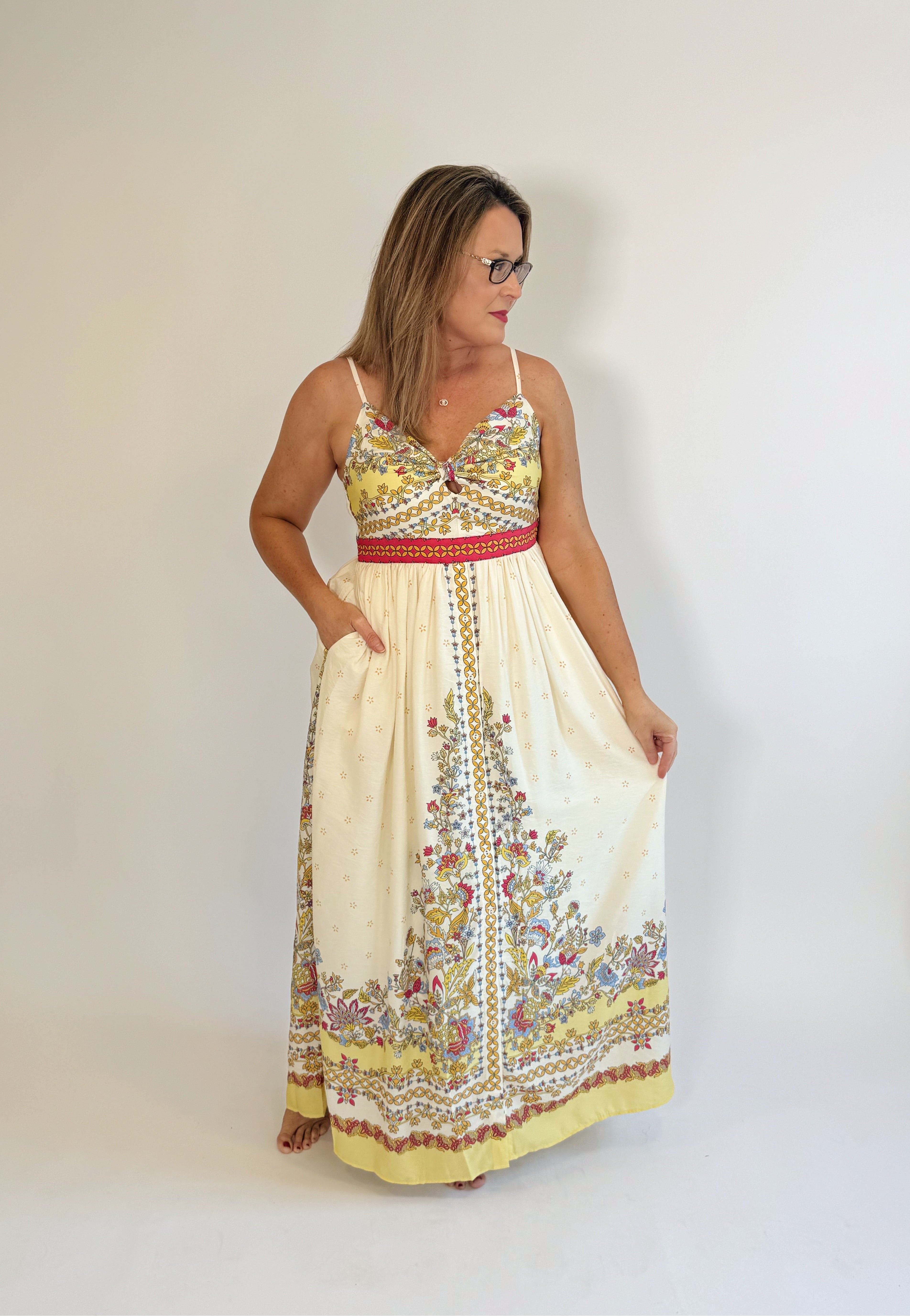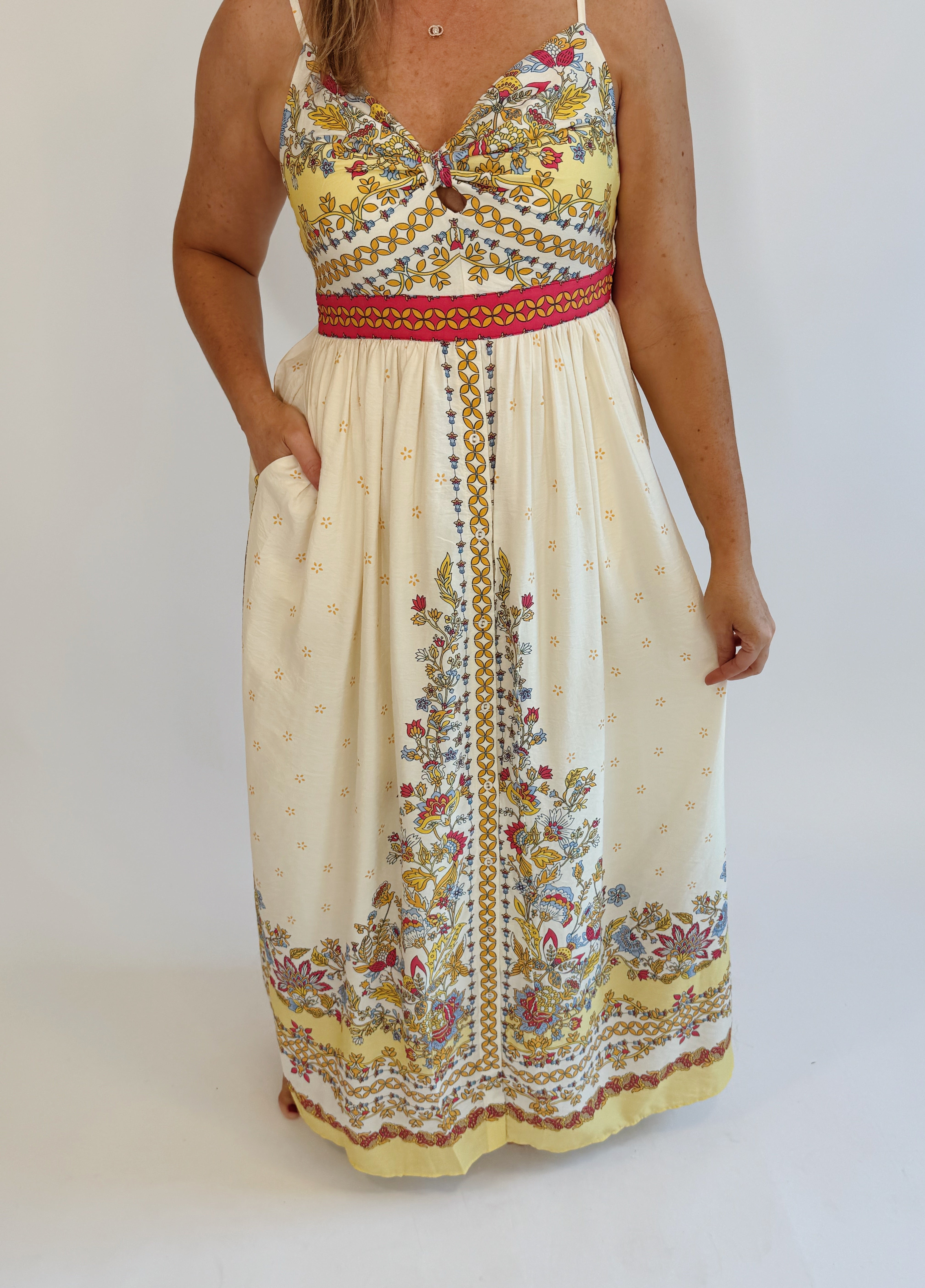 Embrace effortless style with the Island Dream Dress, a playful maxi featuring long, thin straps and a relaxed, slightly oversized fit. Designed for comfort and convenience, it boasts handy pockets and charming buttons cascading from the waist down, perfect for a breezy day or a sunset stroll.