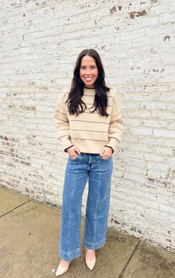 Say hello to Jordan, the sweater that's giving classic with a fun twist. Soft beige paired with crisp navy stripes creates the perfect balance of timeless and playful. Layer it, tuck it, or wear it solo—this versatile piece works with everything in your closet. Cozy enough for lazy days, polished enough for actually leaving the house. Your new go-to for looking put-together without trying too hard.