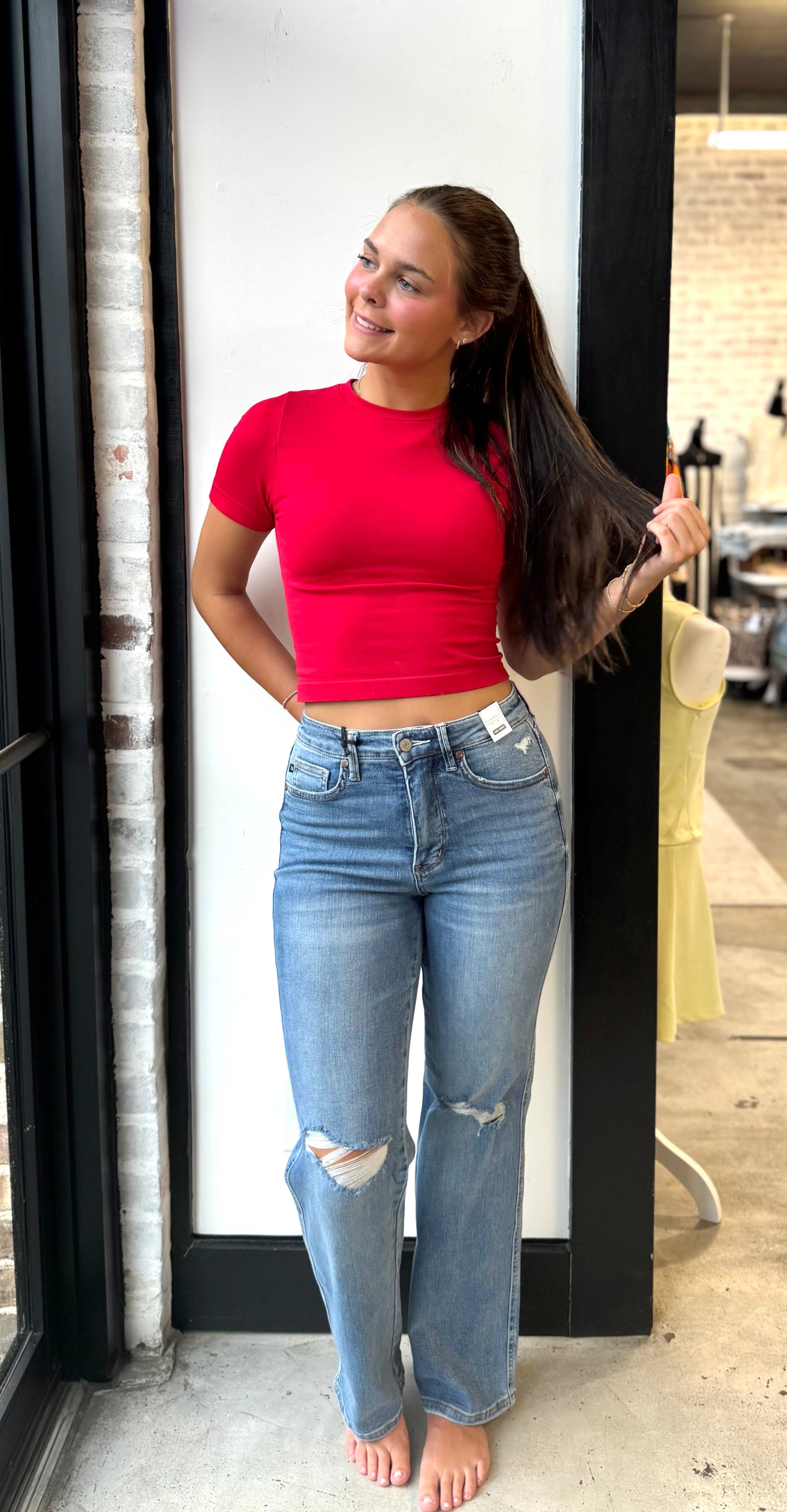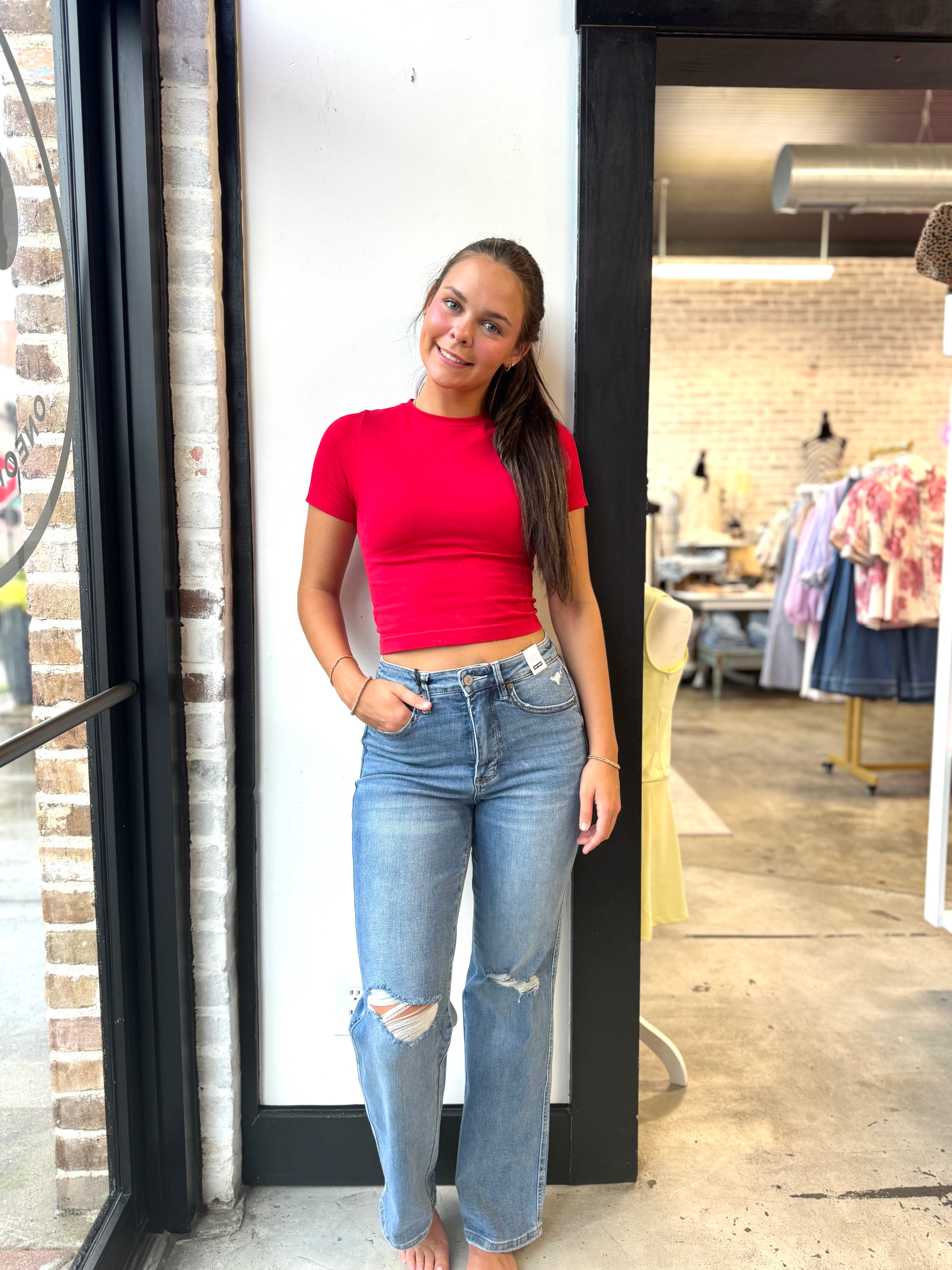 Seriously stylish or stylishly serious? (High-waisted) and (straight), this rip at the knee brings all the grunge vibes to your (denim) look.