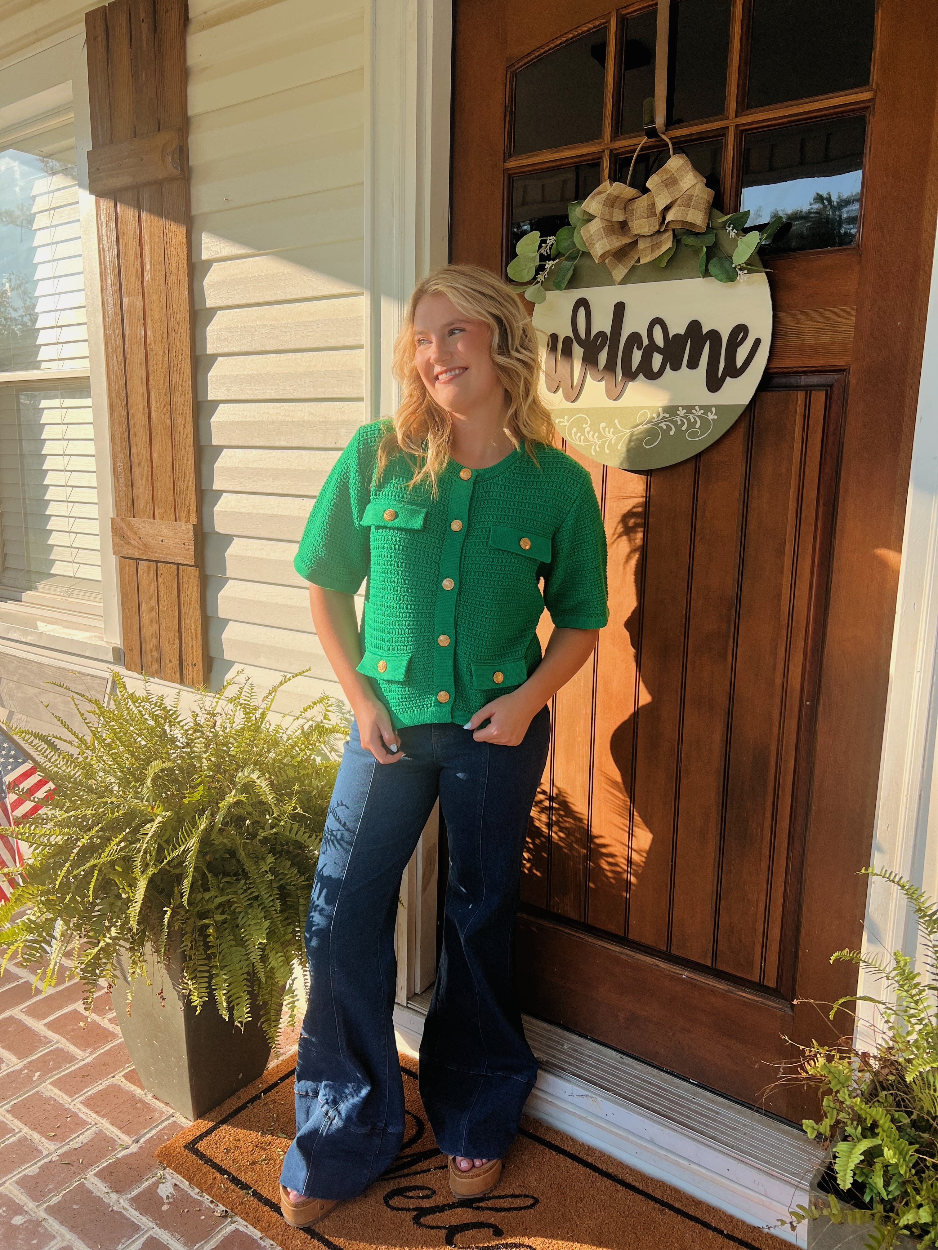 Kelly Green Short Sleeve Sweater with gold buttons