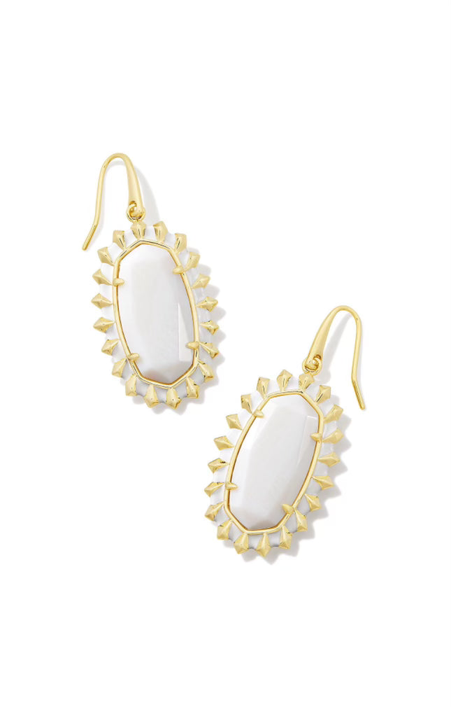 Add a touch of shimmer to your outfit with the Kendra Scott Dani Clear Drop Earrings. Featuring gold accents and white mother of pearl detail, these earrings are a versatile and stylish addition to any jewelry collection. Perfect for a night out or adding a pop of elegance to your everyday look.