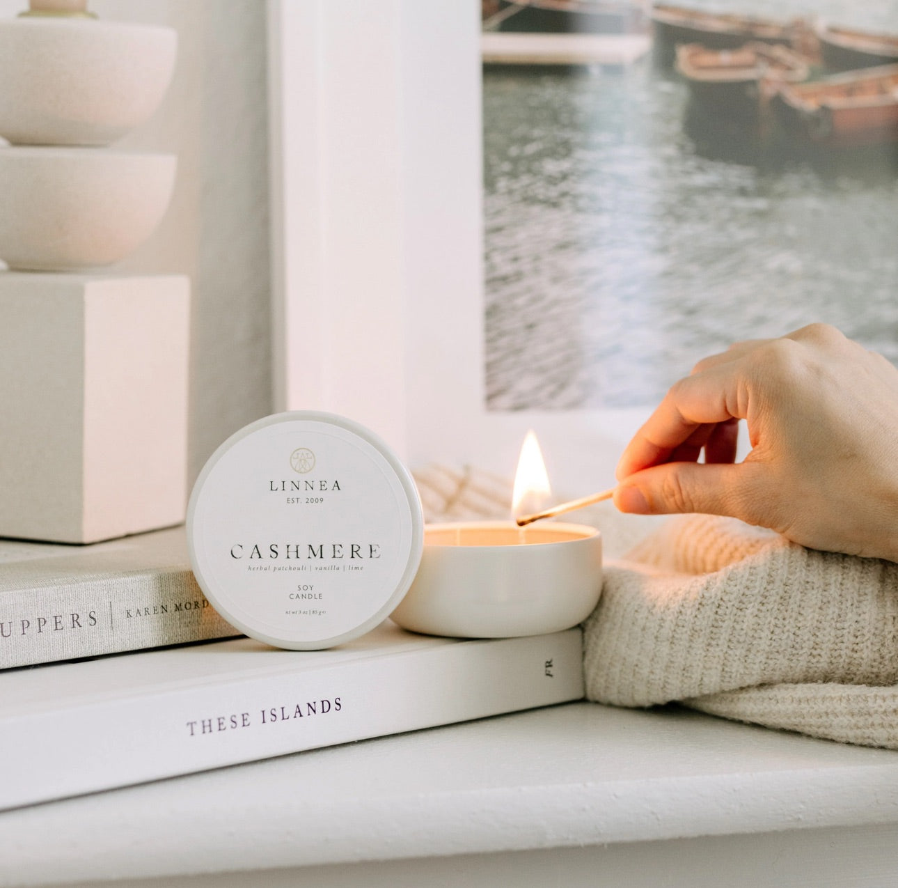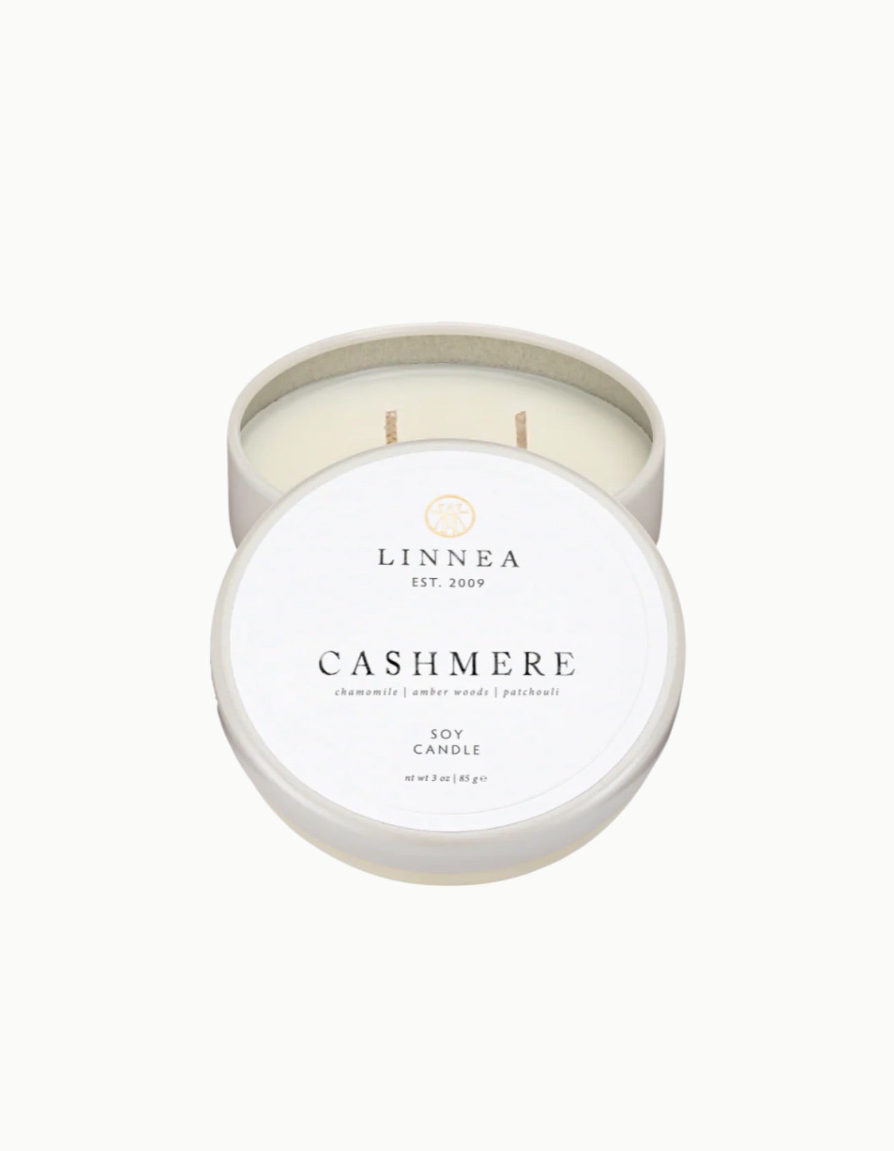 The Cashmere 2-wick Petite Candle is elegantly housed in a pearlized, lidded tin, making it the perfect travel companion. This compact vessel allows you to bring warmth and sophistication to smaller spaces. With soft and sensual notes of chamomile, amber woods, and patchouli, it wraps you in comforting luxury. Once the candle is used, repurpose the tin as a chic jewelry box.