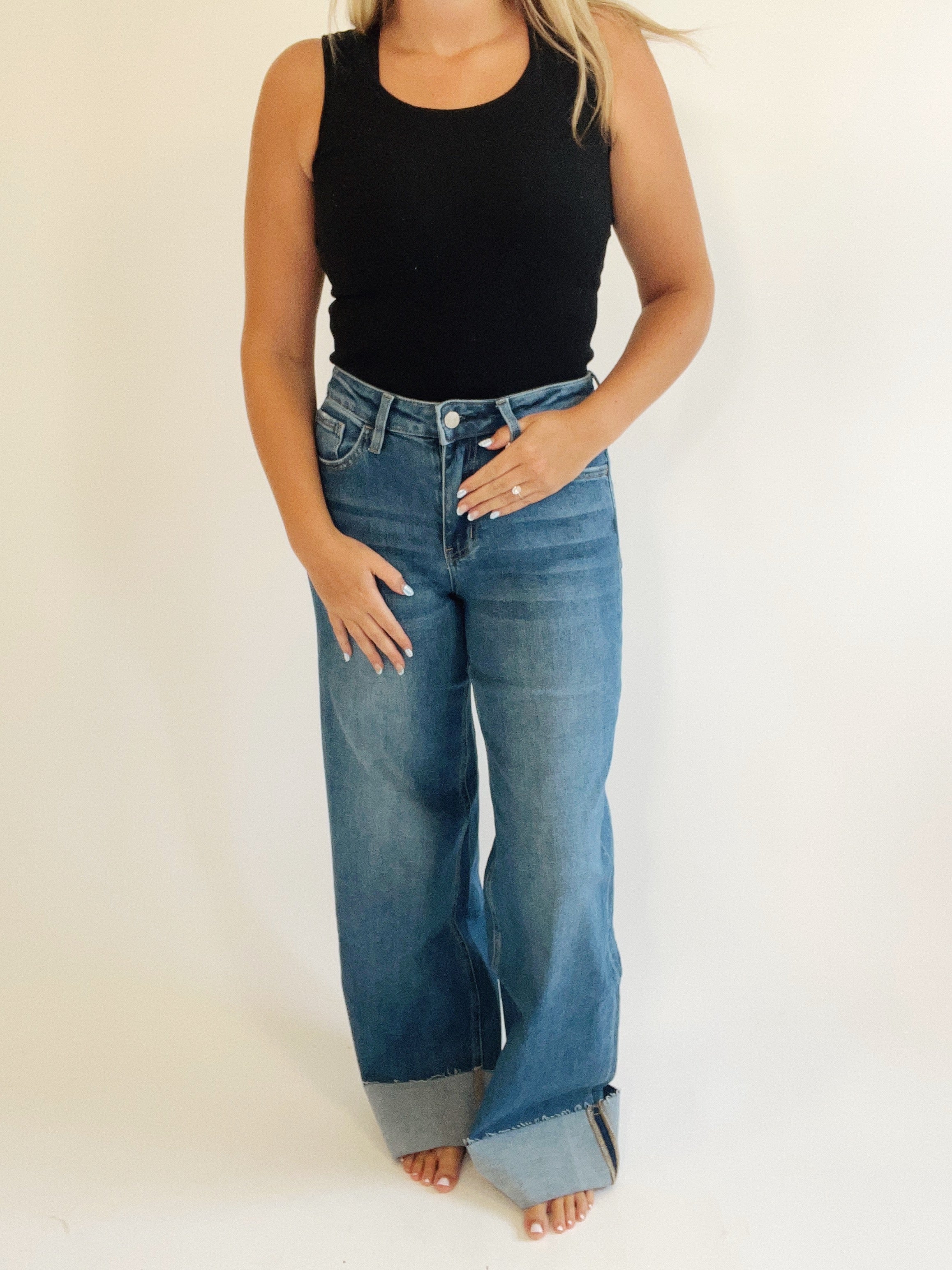 Step into effortless cool with the Lovervet High Rise Wide Leg jeans. Featuring a dark wash and a trendy pegged bottom, these jeans combine vintage charm with a modern twist. The high-rise fit flatters your waist while the wide legs create a breezy, confident silhouette. Perfect for dancing through the day or making a statement on the weekend, these jeans bring playful style to your wardrobe with every step.
