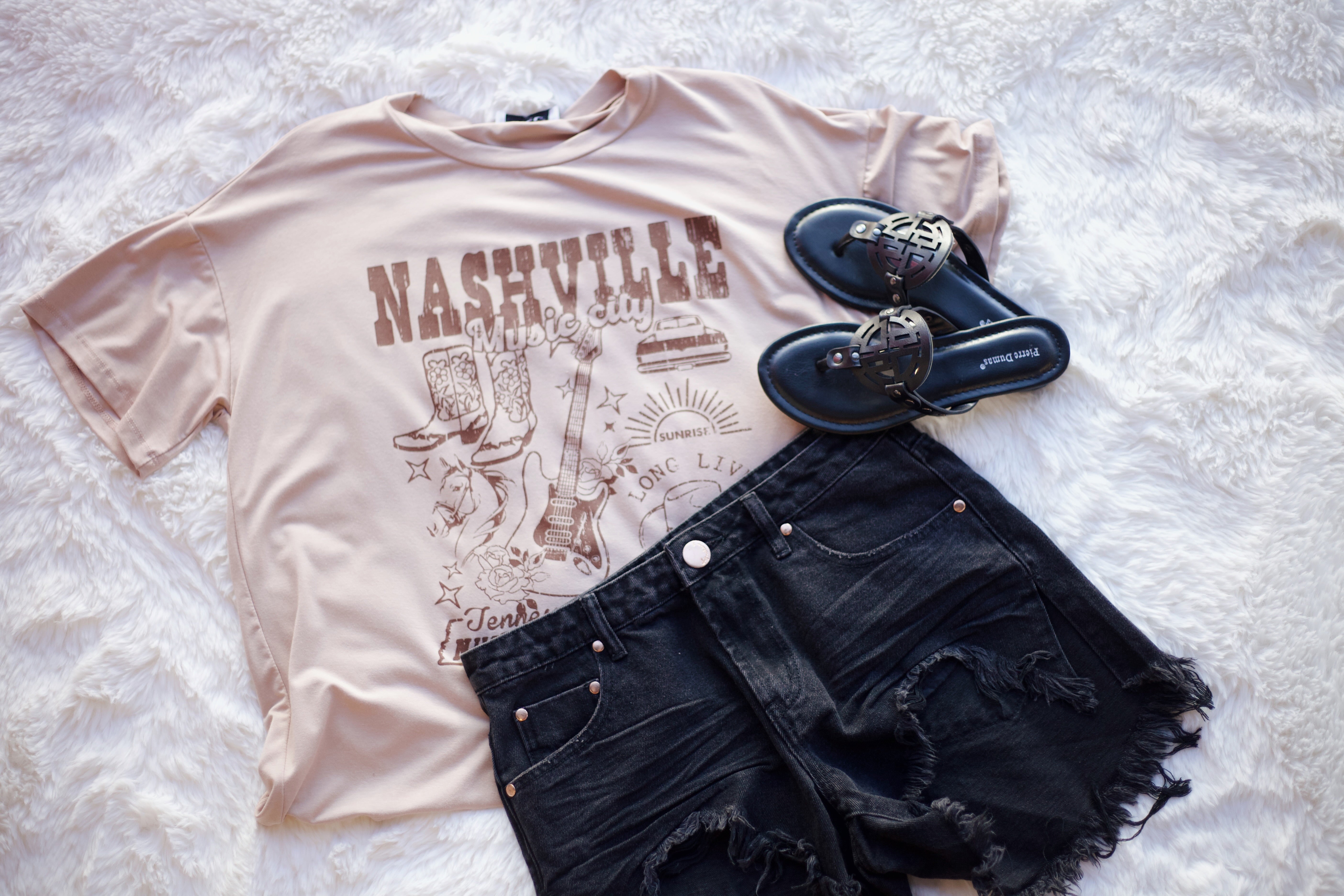 Rock the Music City streets in style with this Nashville graphic tee. Show off your love for the city's vibrant music scene with a touch of brown for a unique look. Let your inner music lover shine with this playful and quirky tee. (Pun intended.)