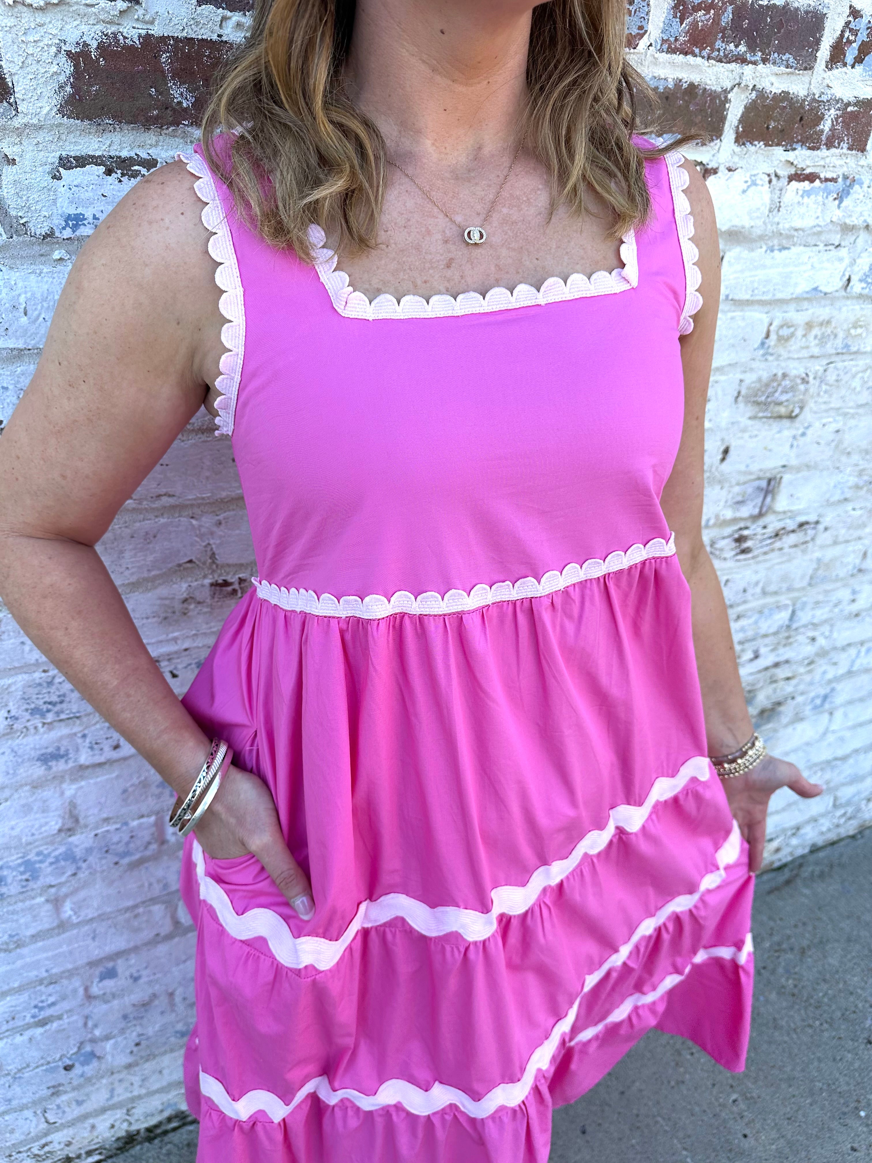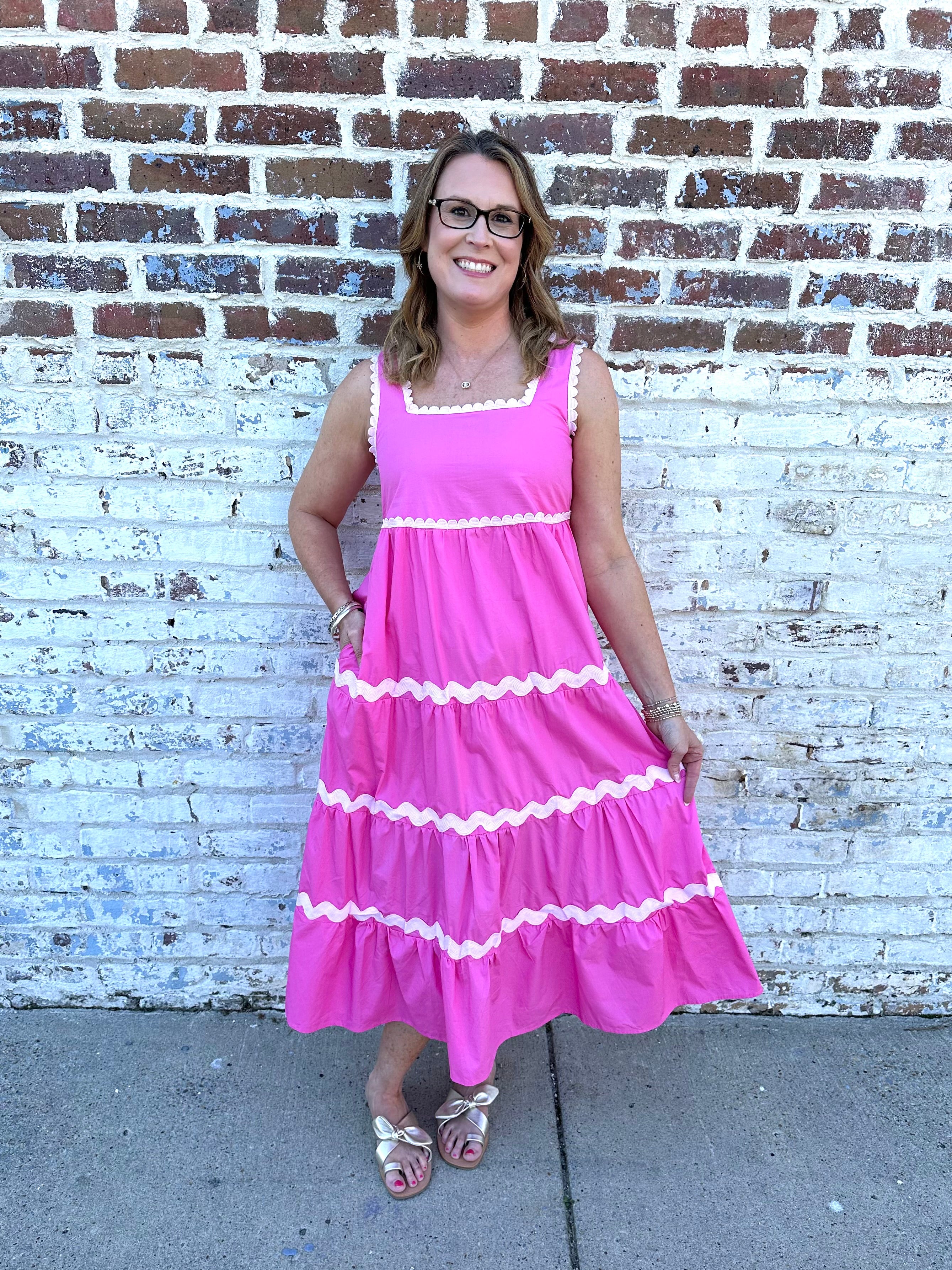 Get ready to make some waves in this pink tiered maxi dress. The wavy design adds a playful touch to this dress, making it perfect for any occasion. Stand out in style and comfort with this unique and trendy piece.