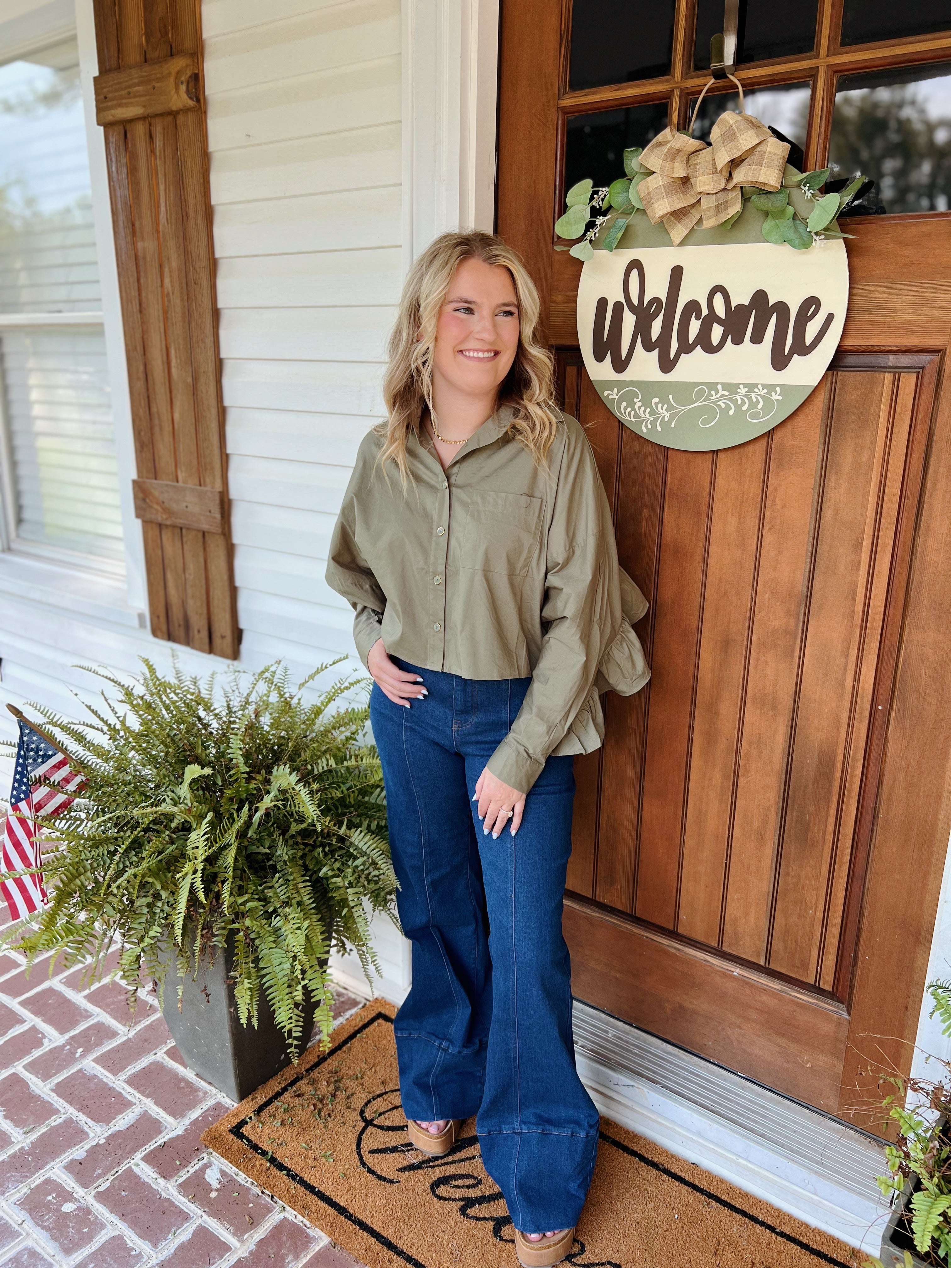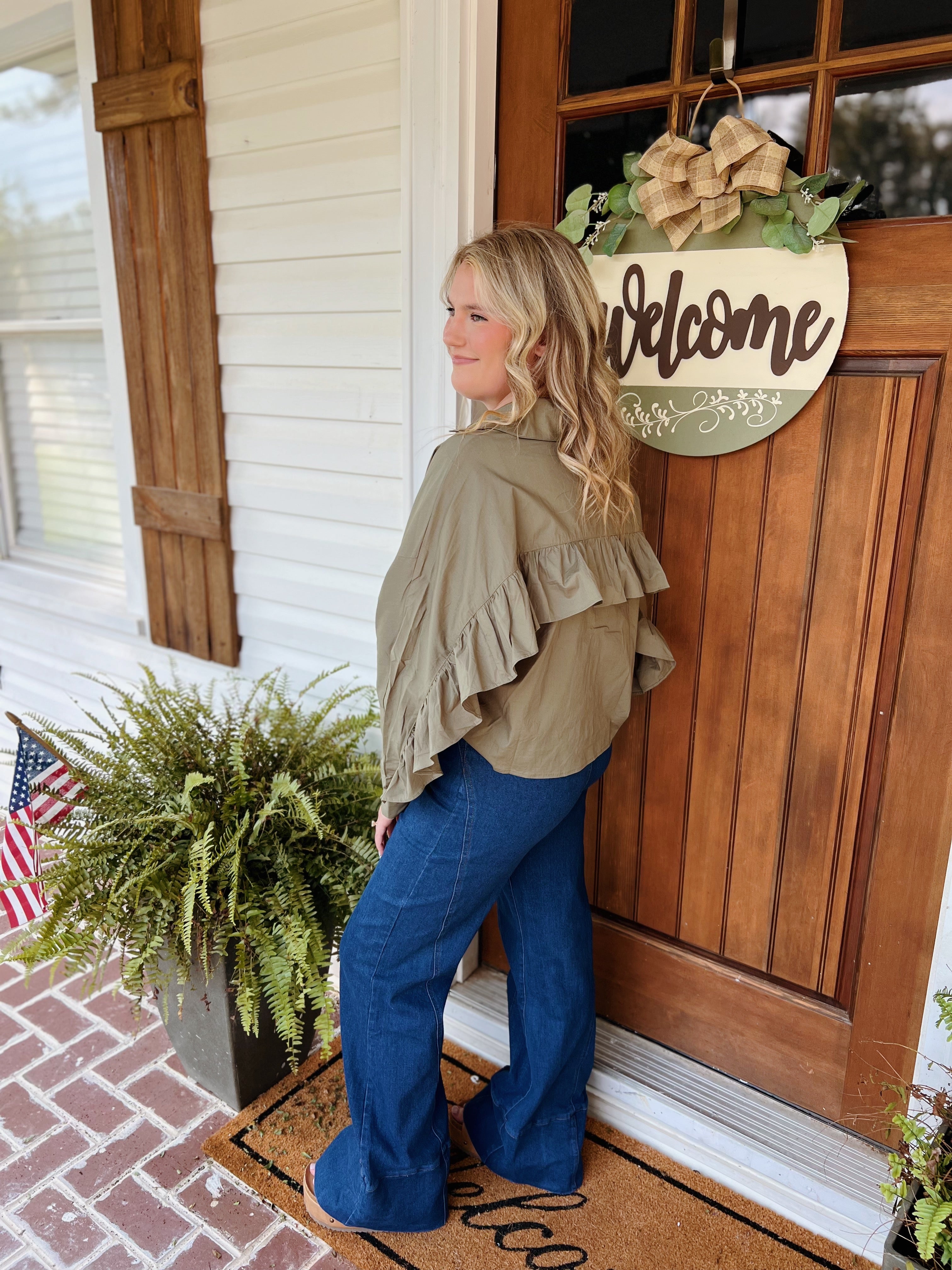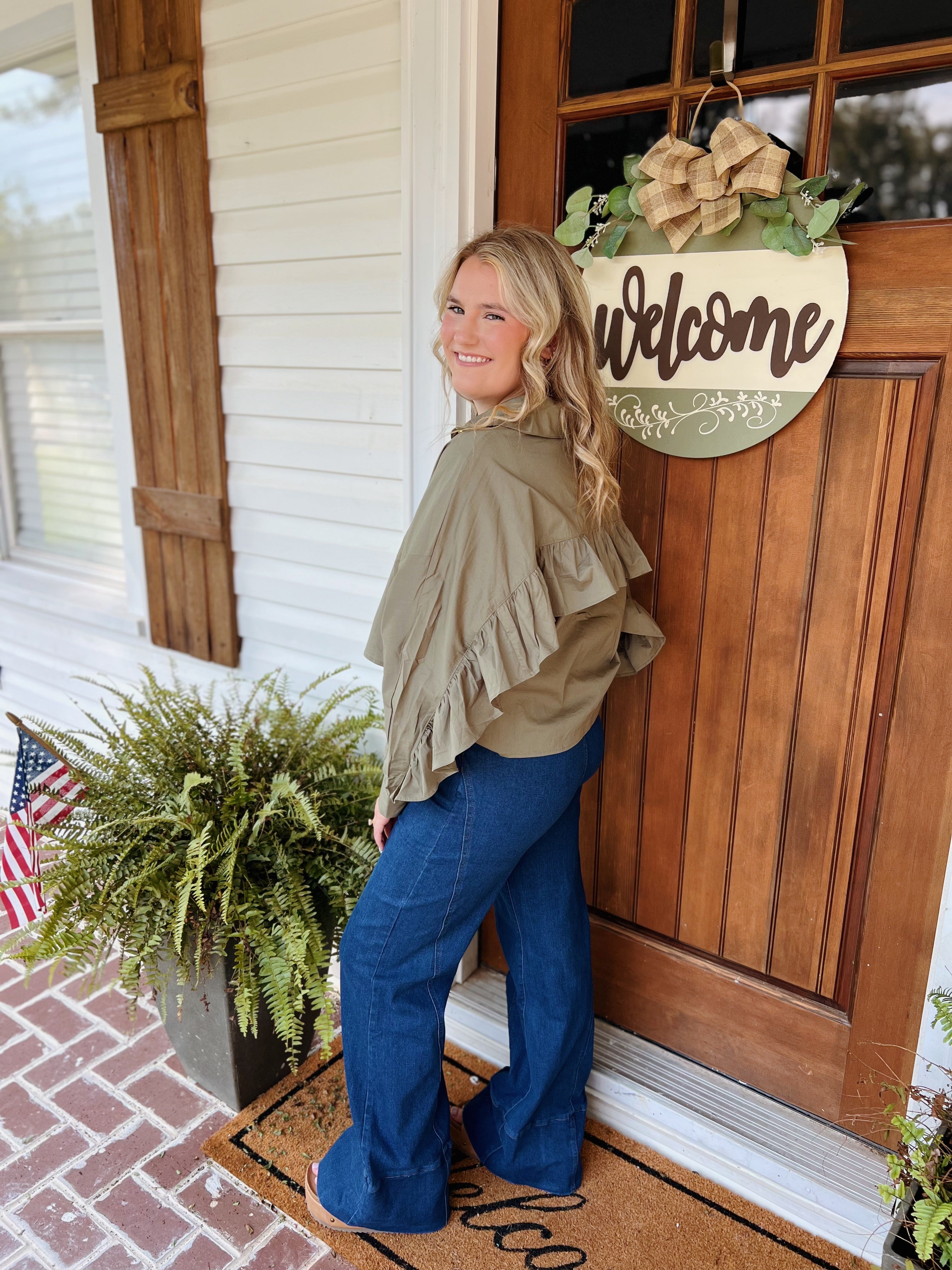 The Poplin Ruffle Back Button Up Top by Karlie features delicate ruffles on the sleeves that add a refined touch to its classic olive silhouette. This elevated piece is designed to seamlessly enhance your core wardrobe, offering a subtle statement that transforms everyday staples into polished looks. Its structured poplin fabric ensures both comfort and durability, making it a versatile addition for sophisticated layering or standout styling.