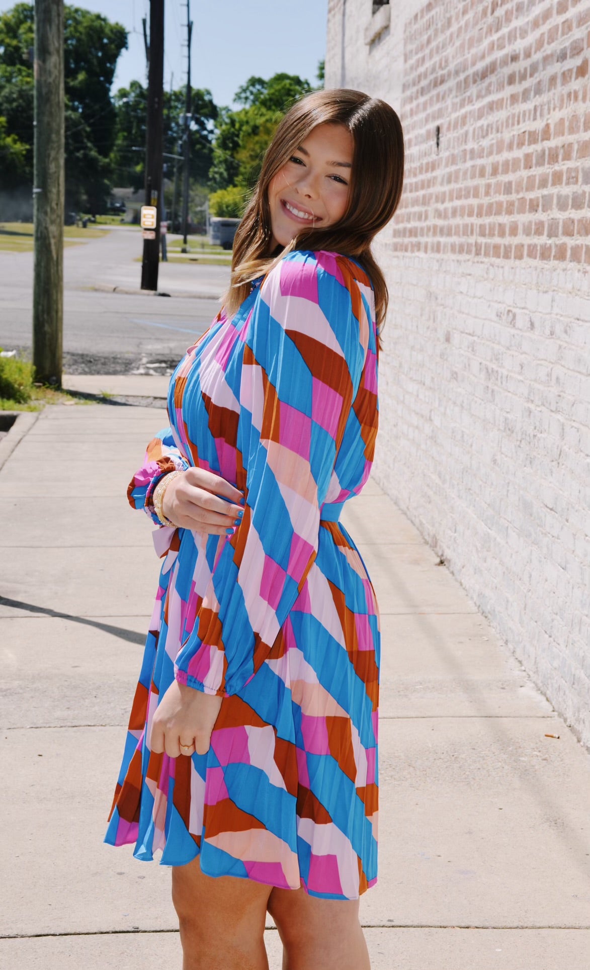 Turn heads in this funky blue retro dress! With long sleeves and a short length, it's the perfect combination of vintage and modern. Stand out in style and stay comfortable all day long.