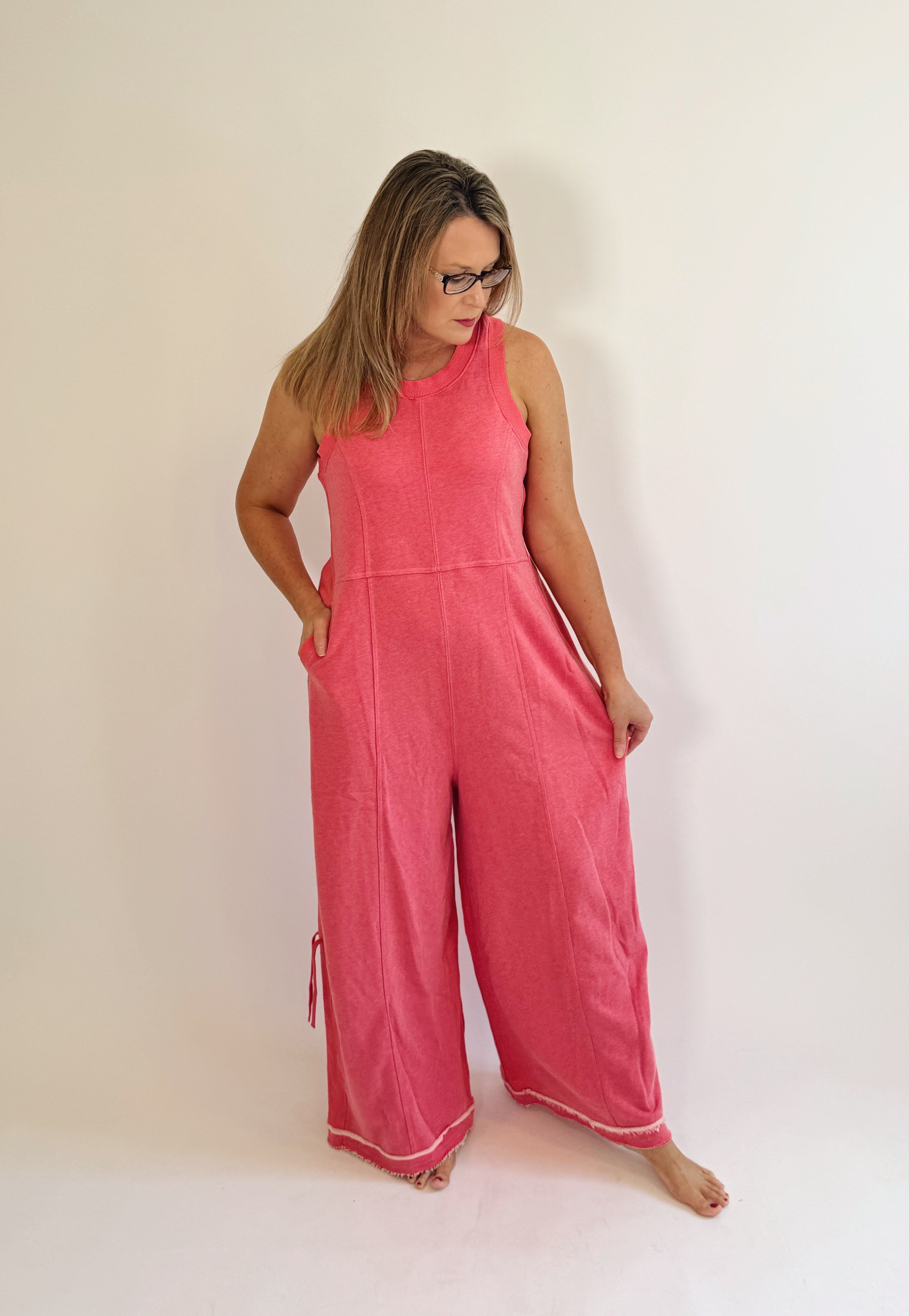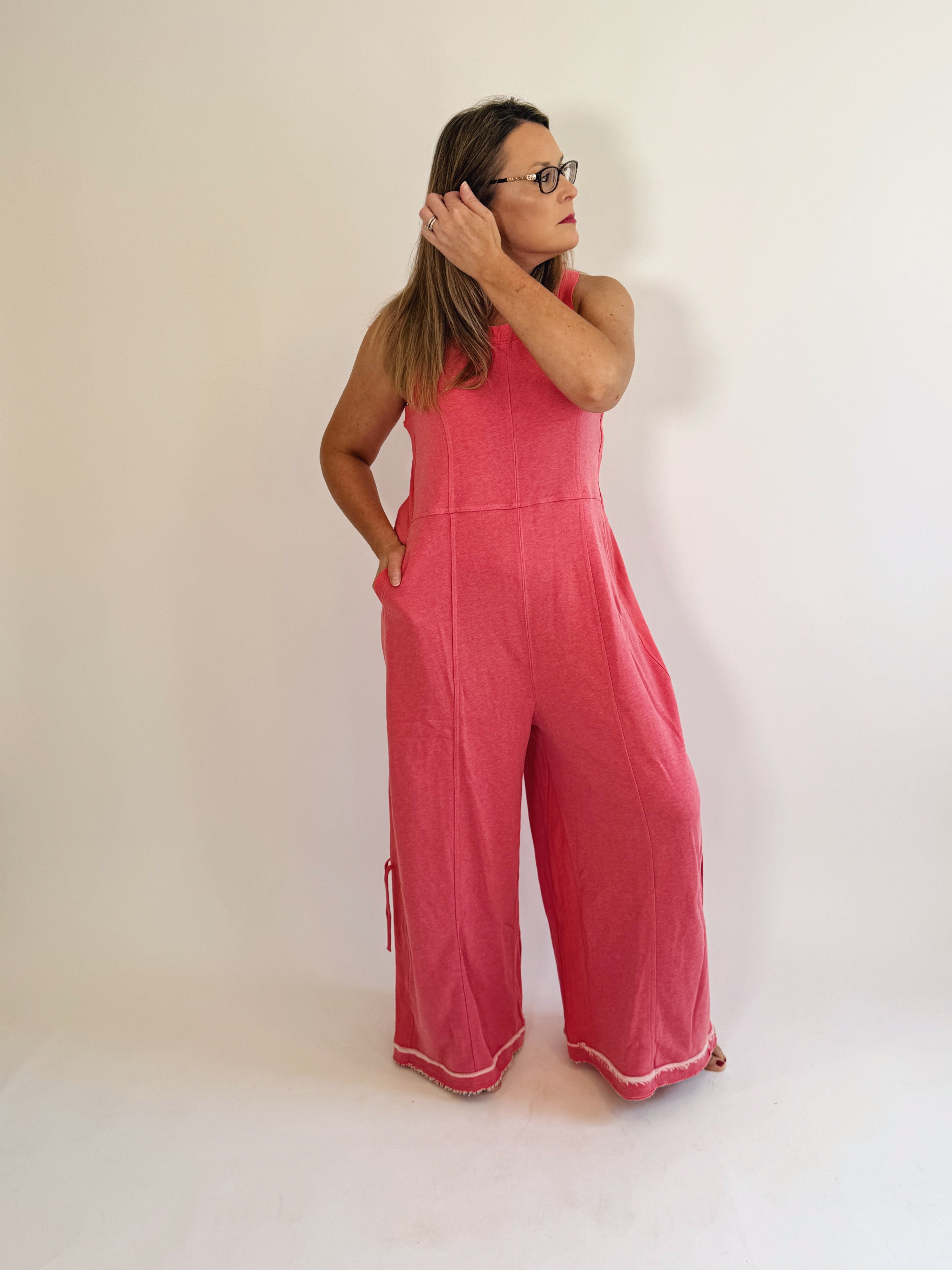 This Rose Pink Jumpsuit combines cozy French terry fabric with a fun, ribbed contrast detail and adjustable ruched side seams for a perfect fit. Made from a soft blend of 50% cotton and 50% polyester, it’s comfy enough for lounging yet stylish enough to wear out. Playful and practical, it’s your new go-to for effortless cool.
