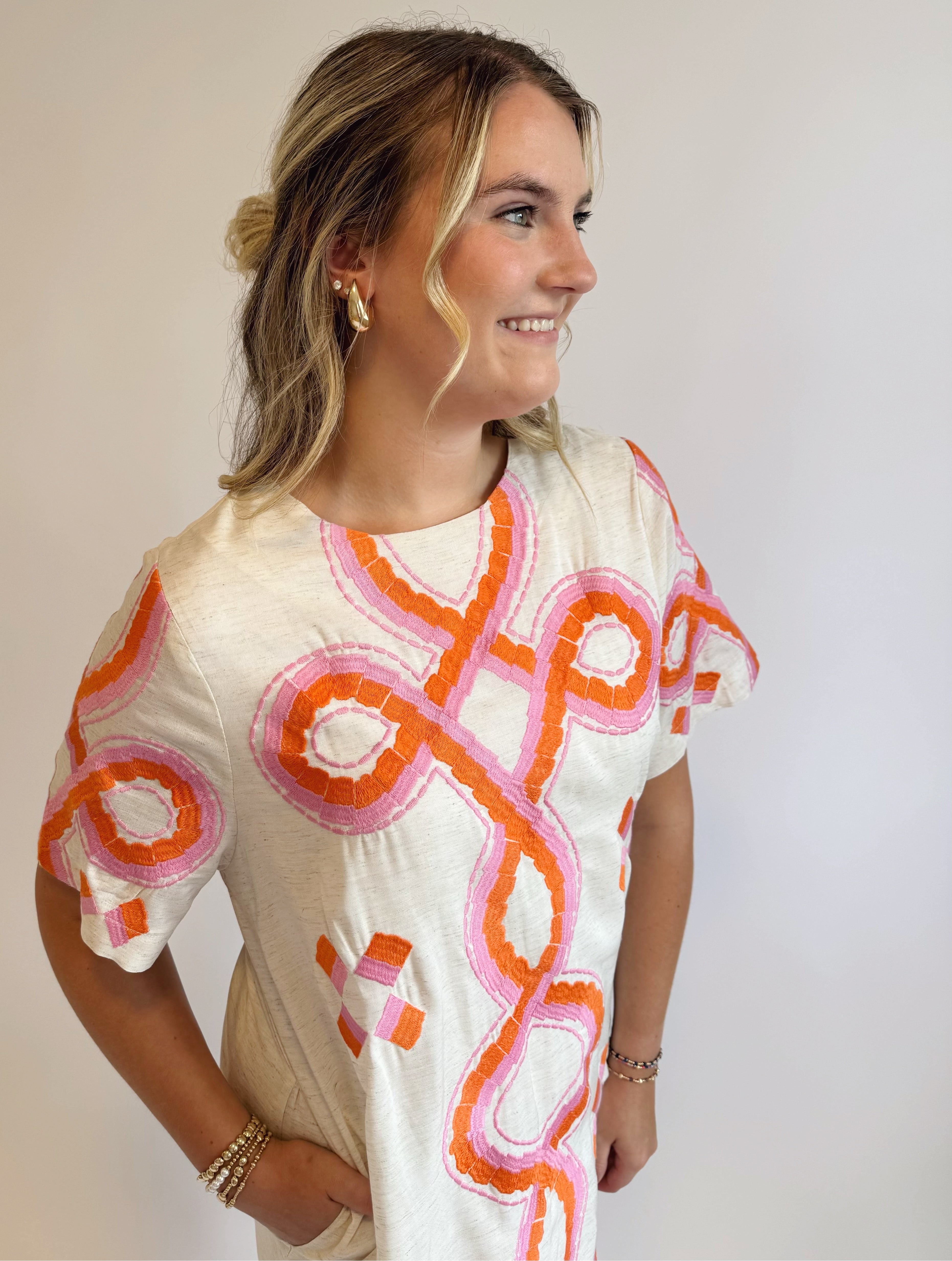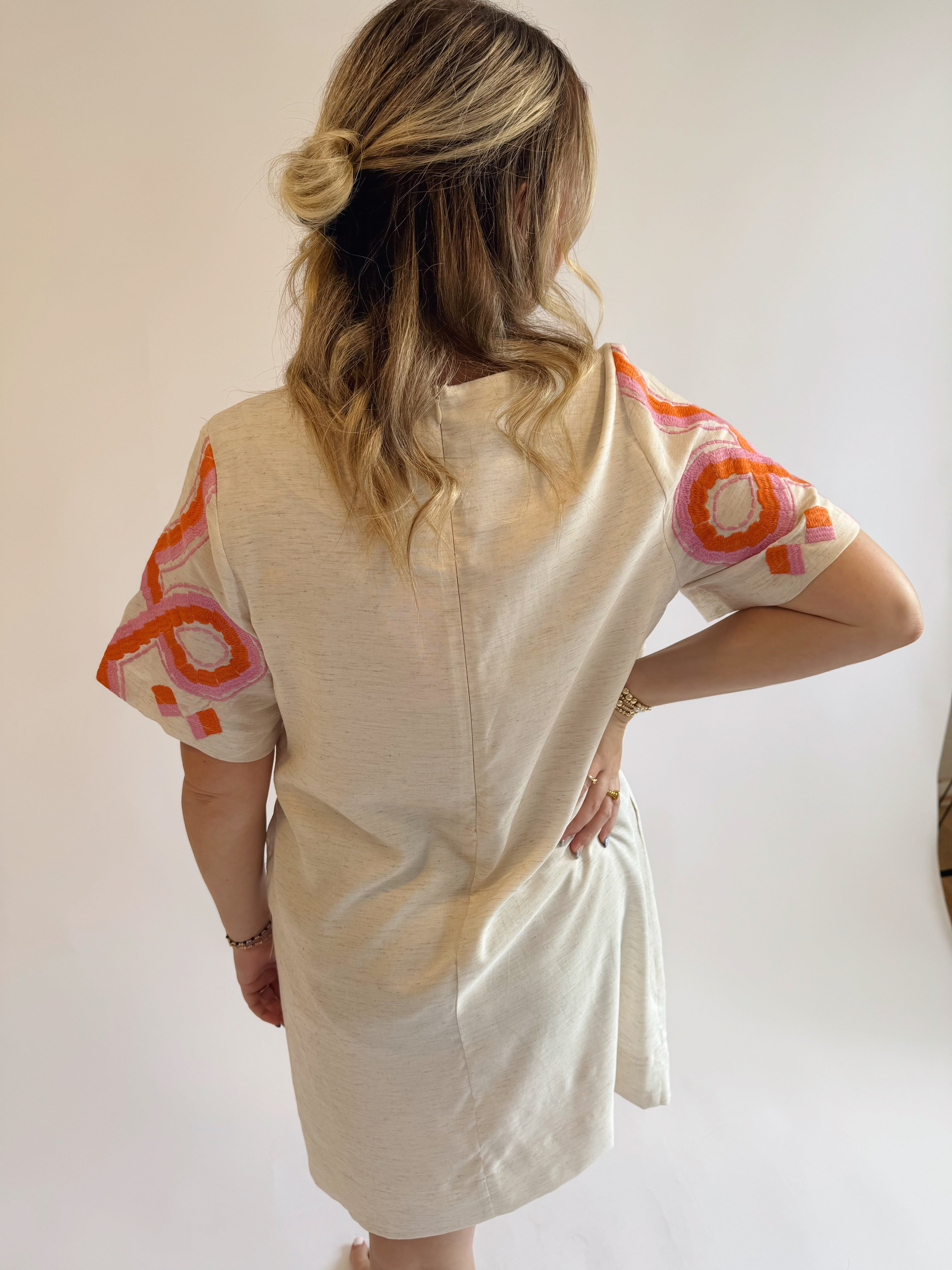 oatmeal color with pink and orange embroidery