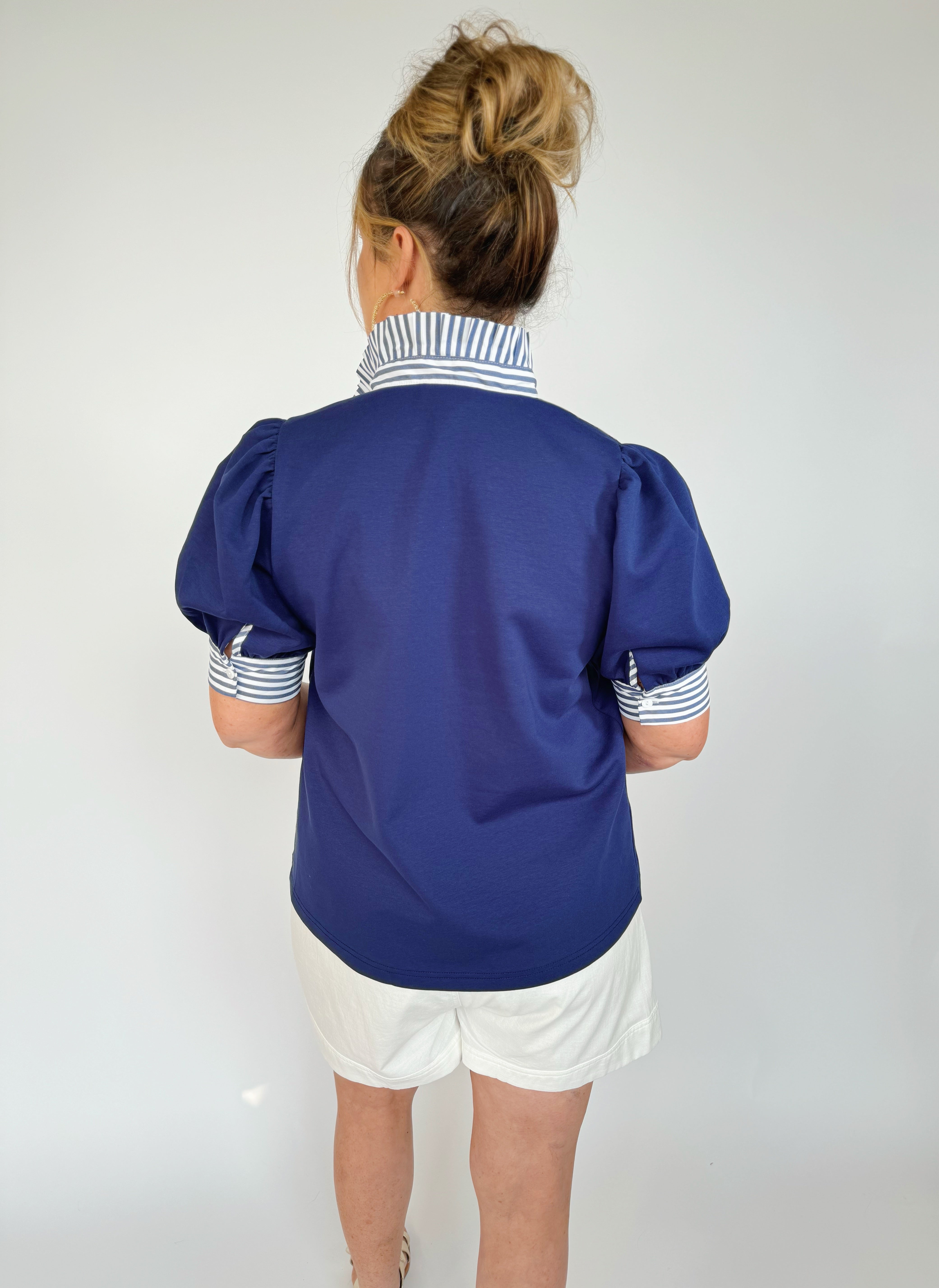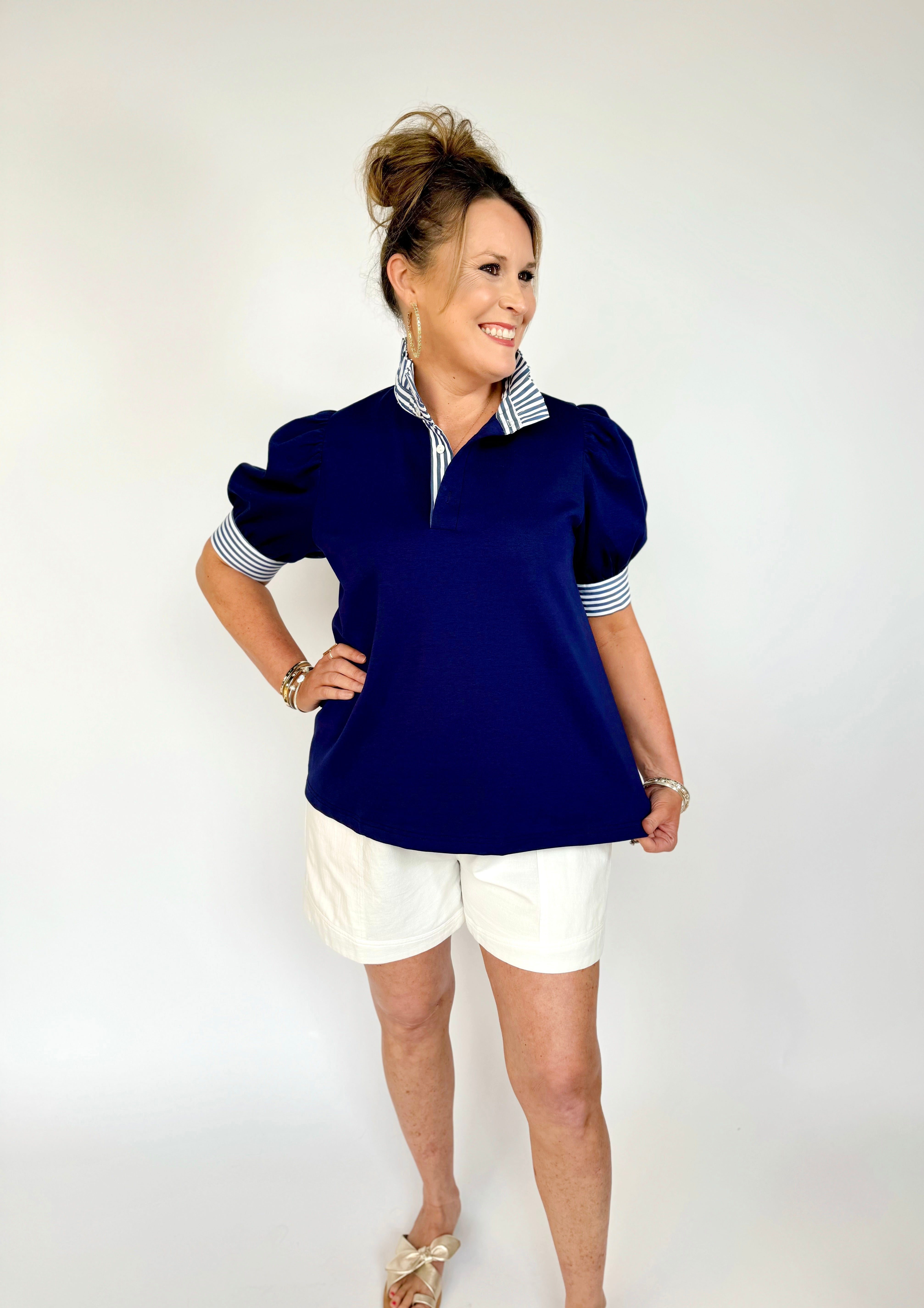 This Set Sail Top features a classic navy design accented with crisp white and navy stripes on the sleeve cuffs and collar. Crafted for a refined nautical look, it offers a polished yet comfortable fit ideal for both casual and semi-formal occasions. The subtle striping detail enhances its timeless appeal, making it a versatile addition to your wardrobe.
