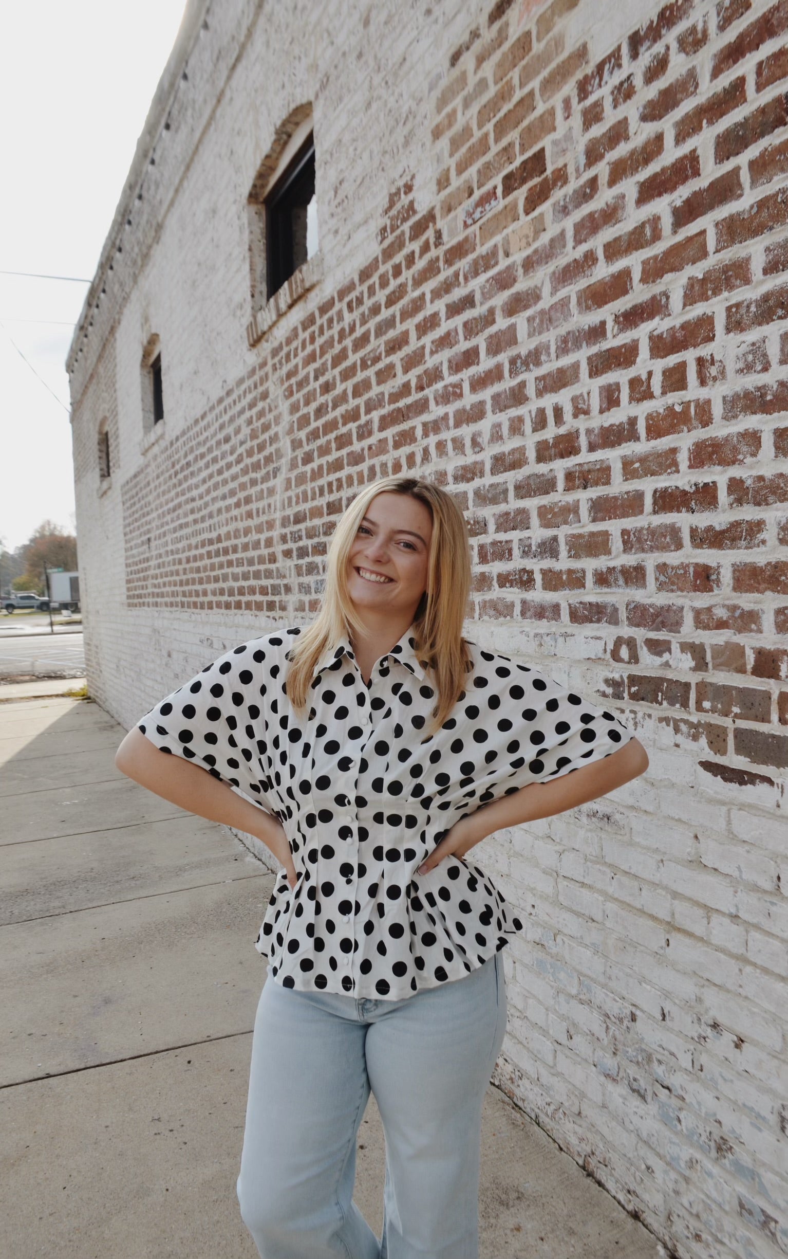 Add a touch of whimsy to your wardrobe with The Dot Blouse. Featuring mid length sleeves and a playful button down front, this off white blouse is adorned with black dots for a unique and stylish look. Perfect for any occasion, this blouse is sure to make a statement! (Only 40 words, bonus points for brevity!)