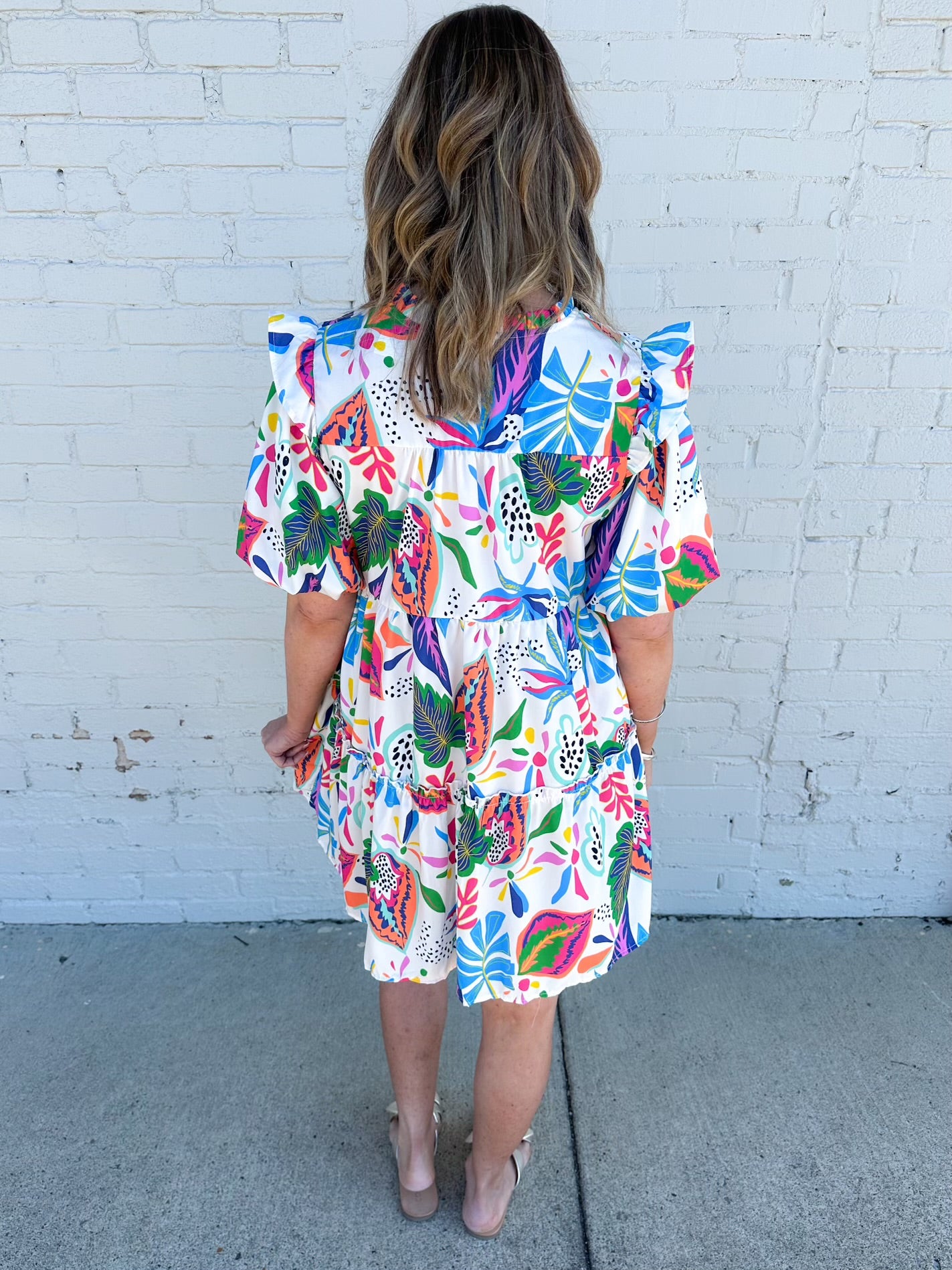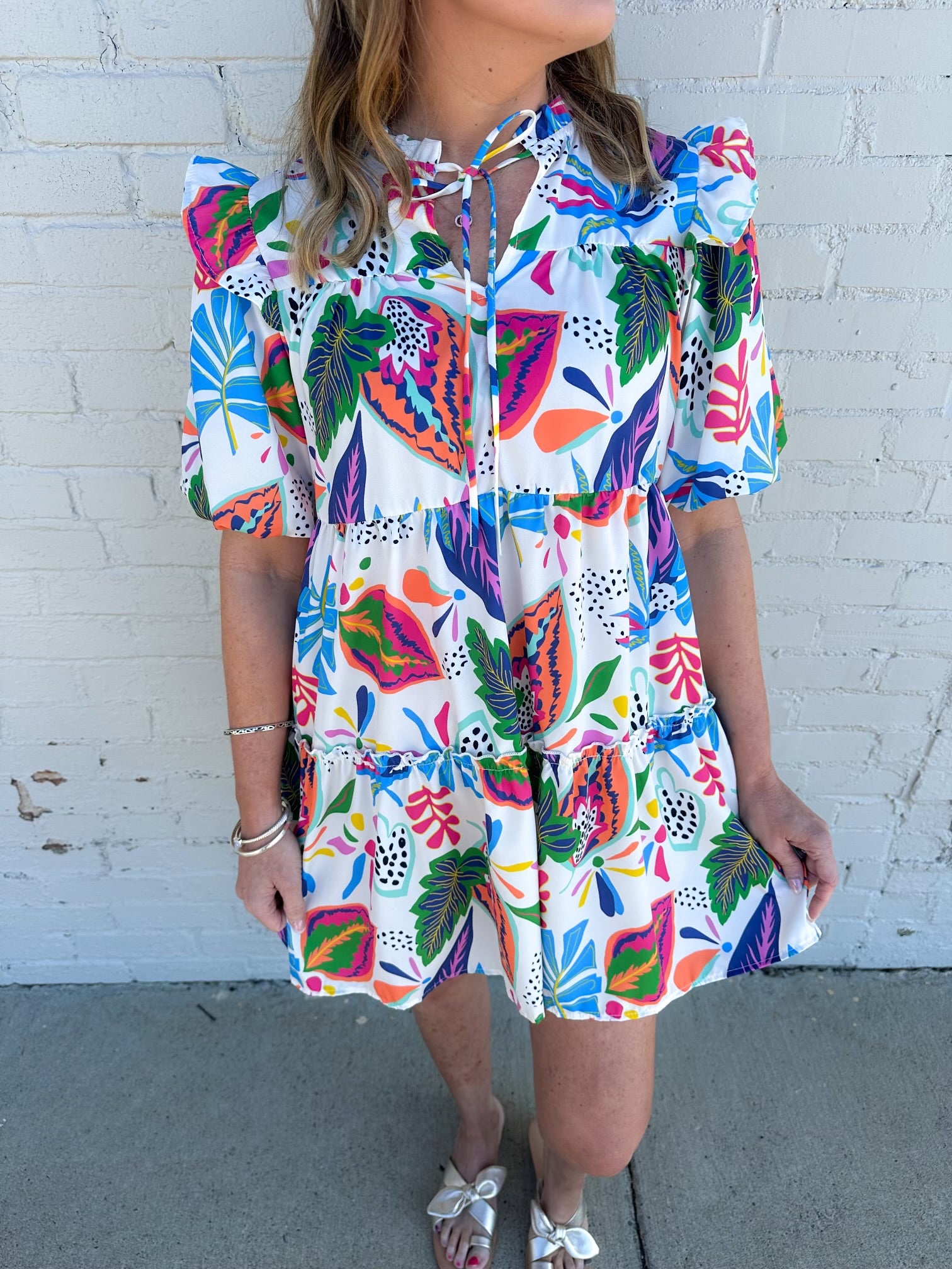 Get ready for some fun in the sun with this tropical mini dress! With its vibrant floral and tropical print, you'll turn heads wherever you go. Perfect for any summer occasion, this dress will have you feeling like a tropical paradise (without the hefty airfare)!
