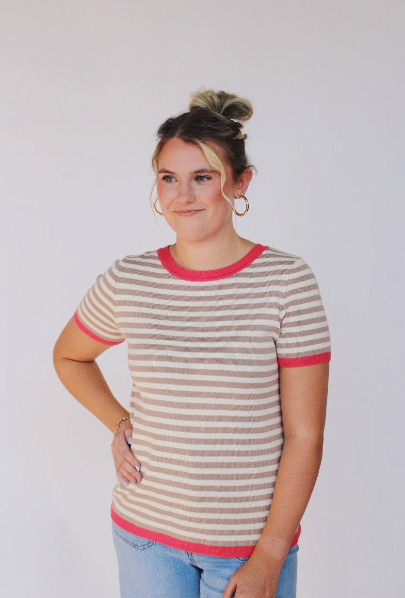 Taupe colored trimmed crew neck short sleeve striped top