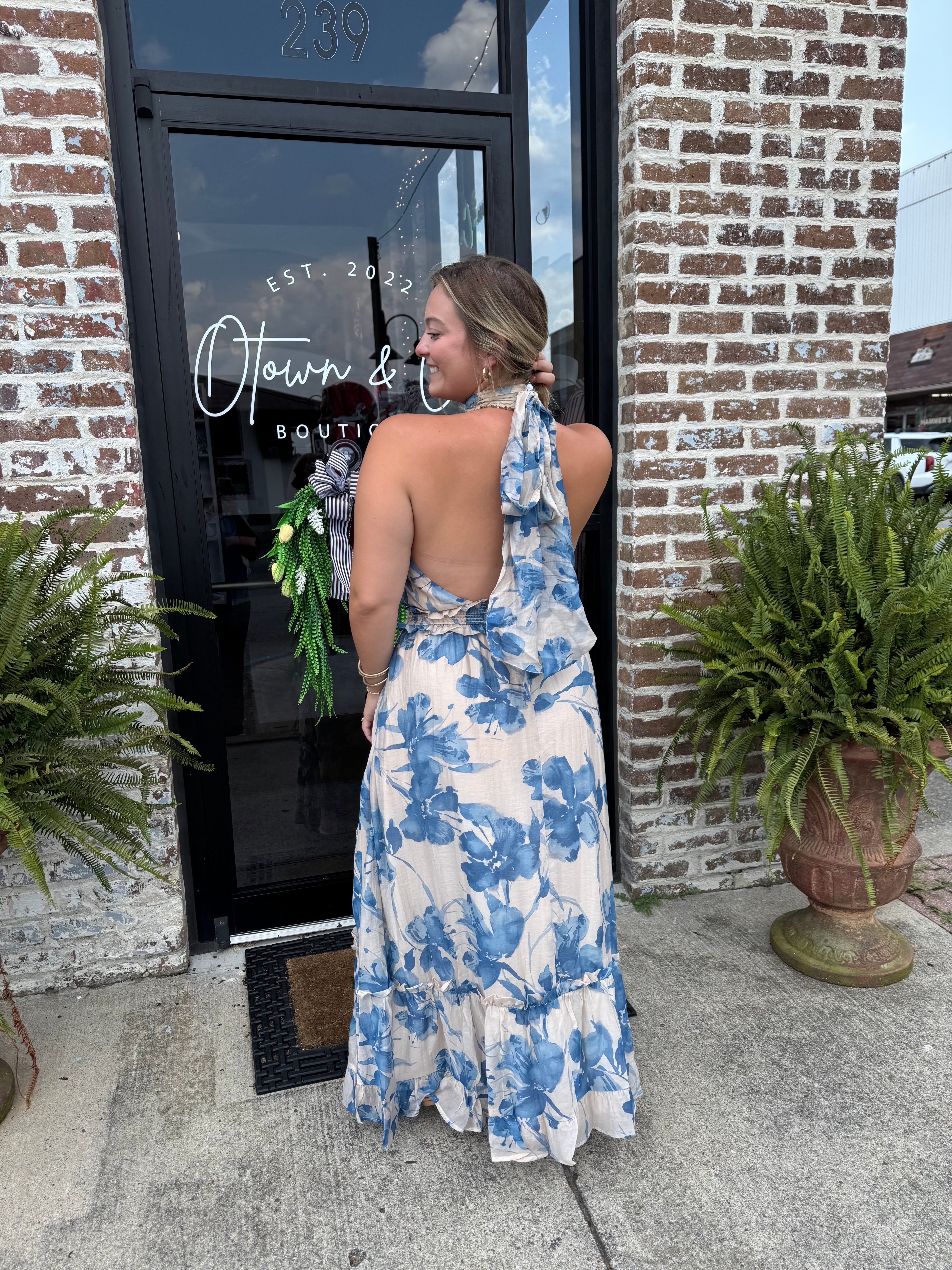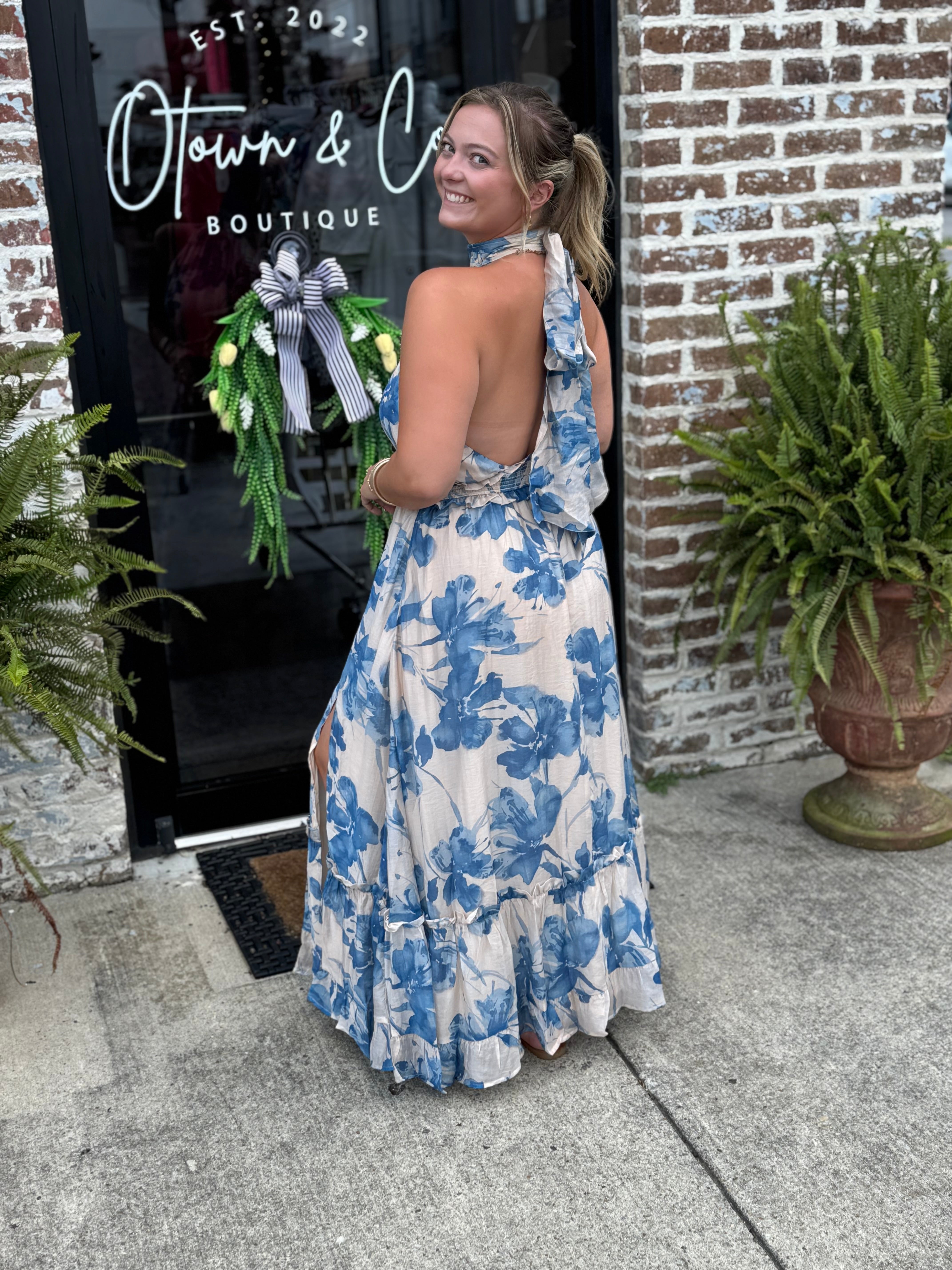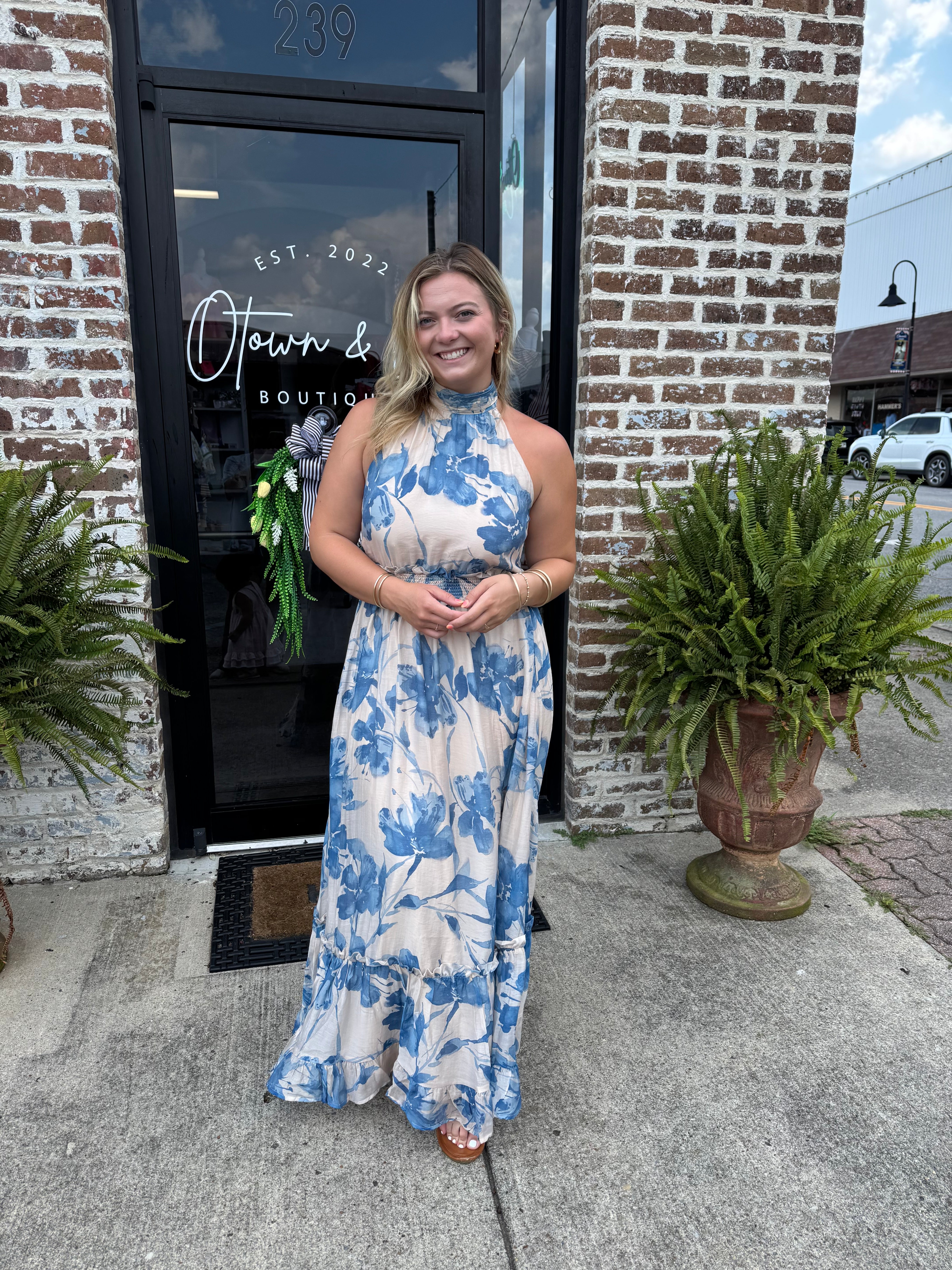 This playful halter maxi dress in beautiful blue and cream is perfect for any wedding party. Featuring a flattering side slit and a charming tie at the back of the neck, it combines elegance with a touch of fun. Flow effortlessly and turn heads with this stylish, comfortable dress made to celebrate special moments.