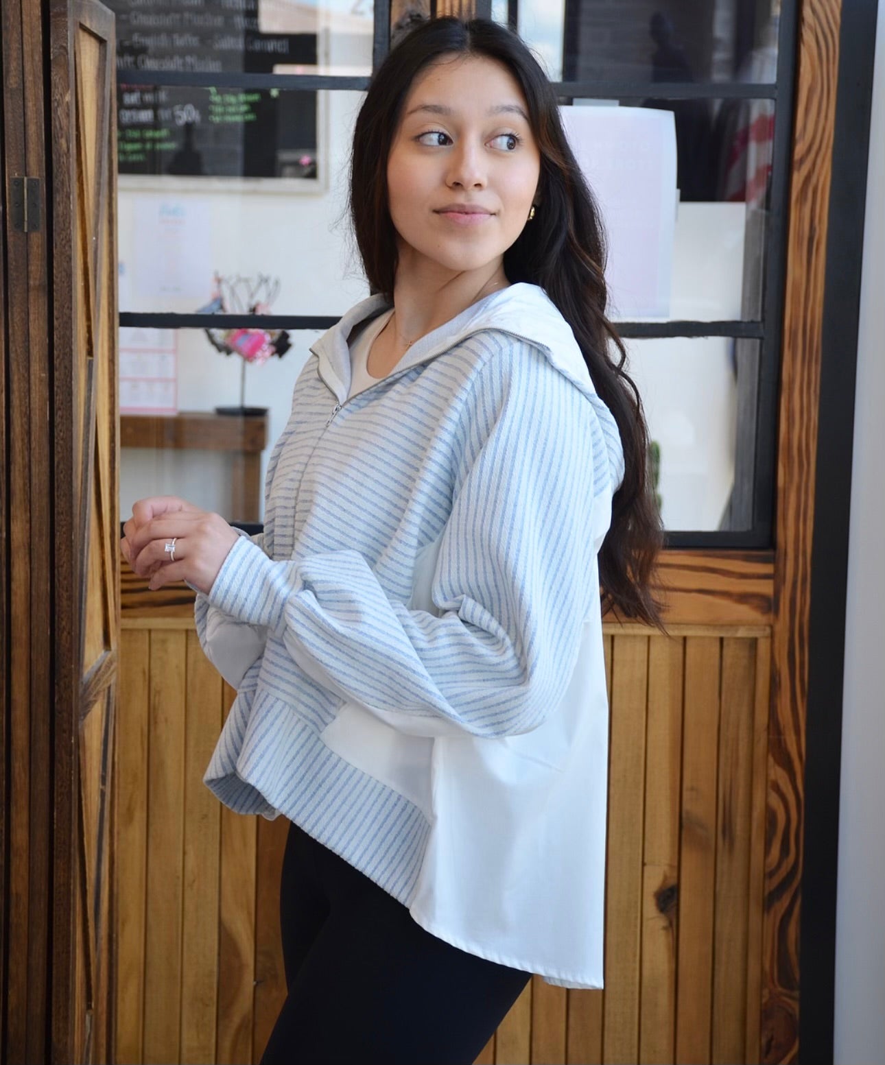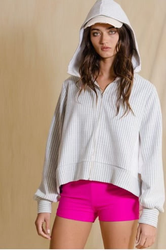 Stay cozy and cool in our blue and white striped hoodie. With a convenient zip up design and a stylish hood, this hoodie is perfect for any casual outing. Plus, the stripes add a touch of fun and uniqueness to your wardrobe. Zip up and stay stylish!